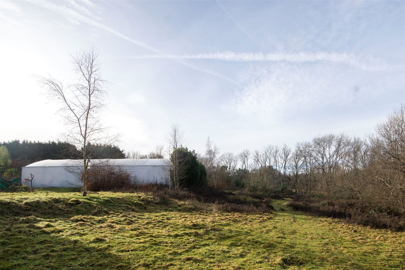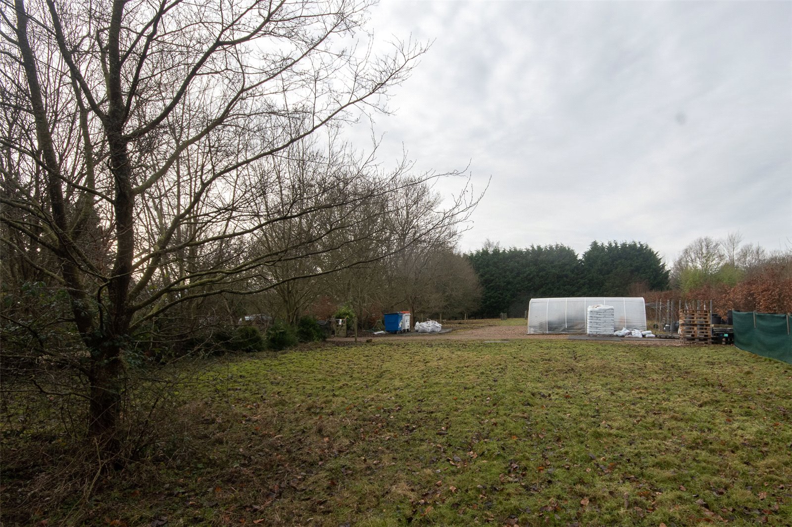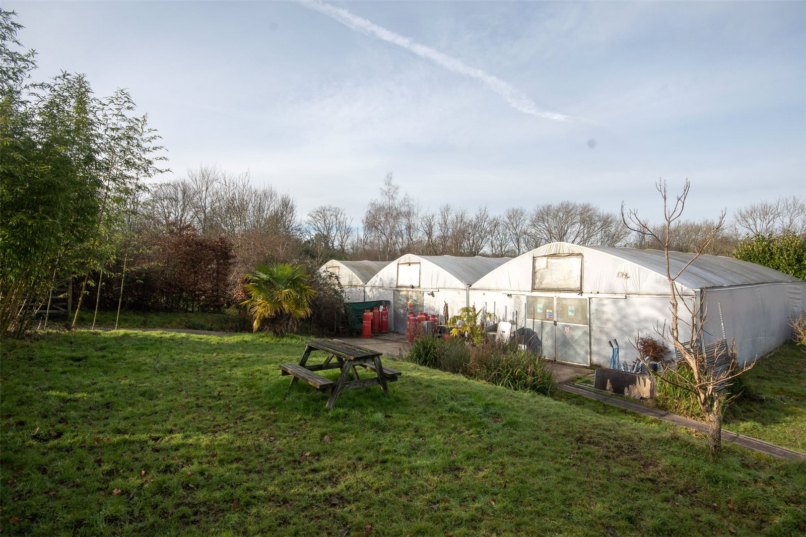 There is then a further level of much larger polytunnels and to each far side and behind are lawned areas. Behind and beyond is a small wooded area and to the side a conifer section.