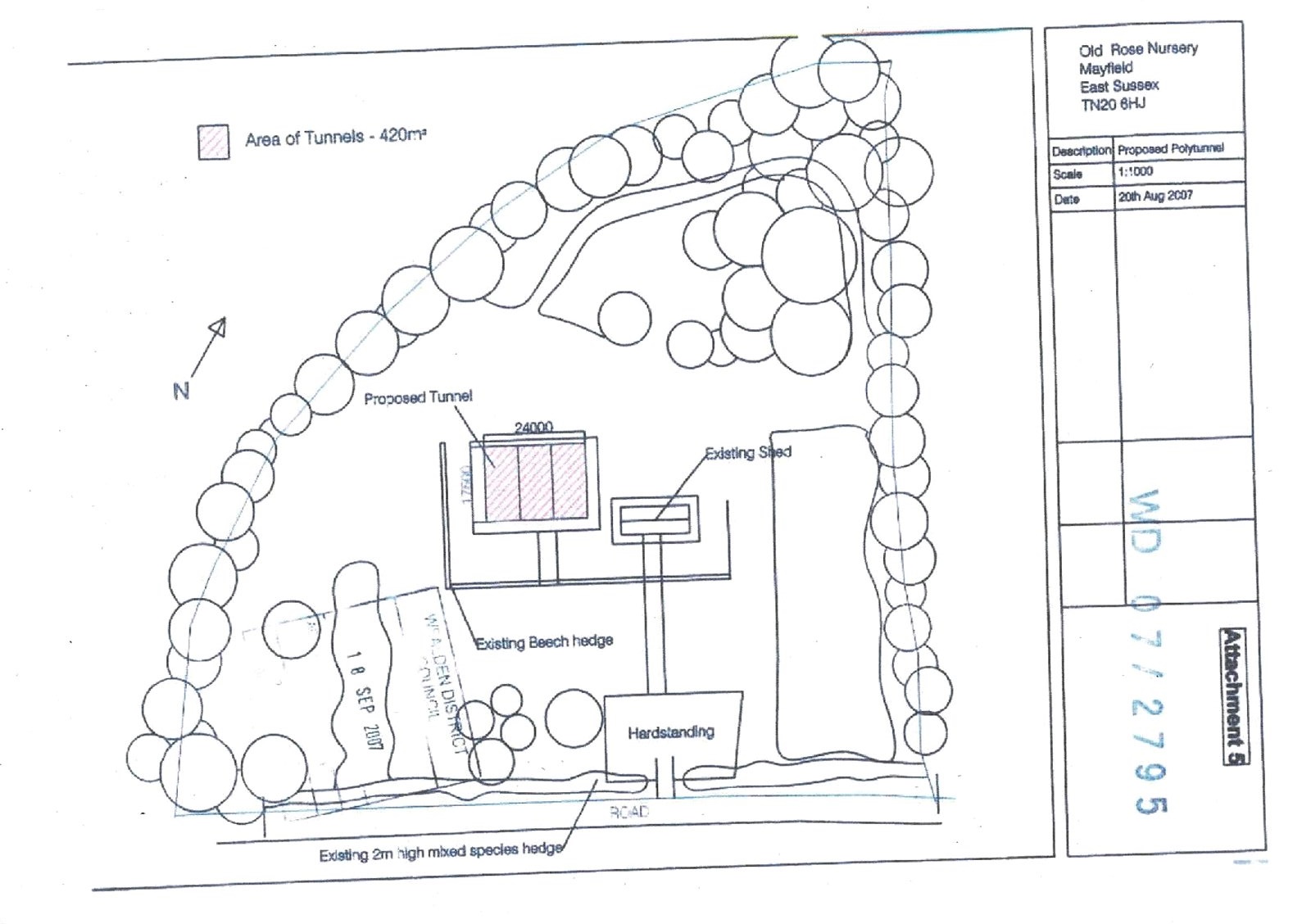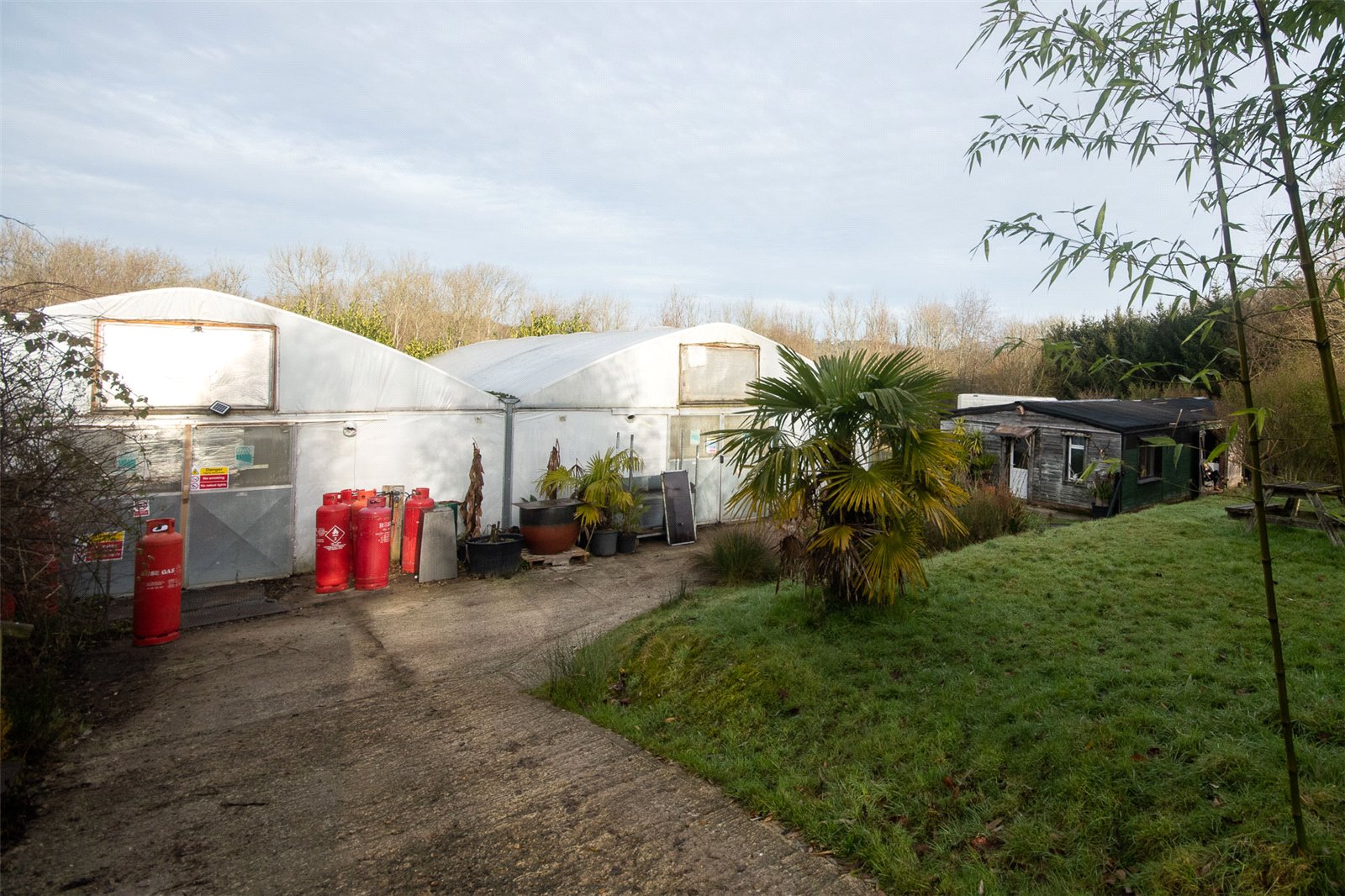 LAYOUT OF SITE: A wide driveway leads into a large gravel drive and parking area. Beyond is a further gravel and hard standing area with a number of polytunnels. To the right side of the tunnels is a path leading to the large office building of brick and wooden construction.