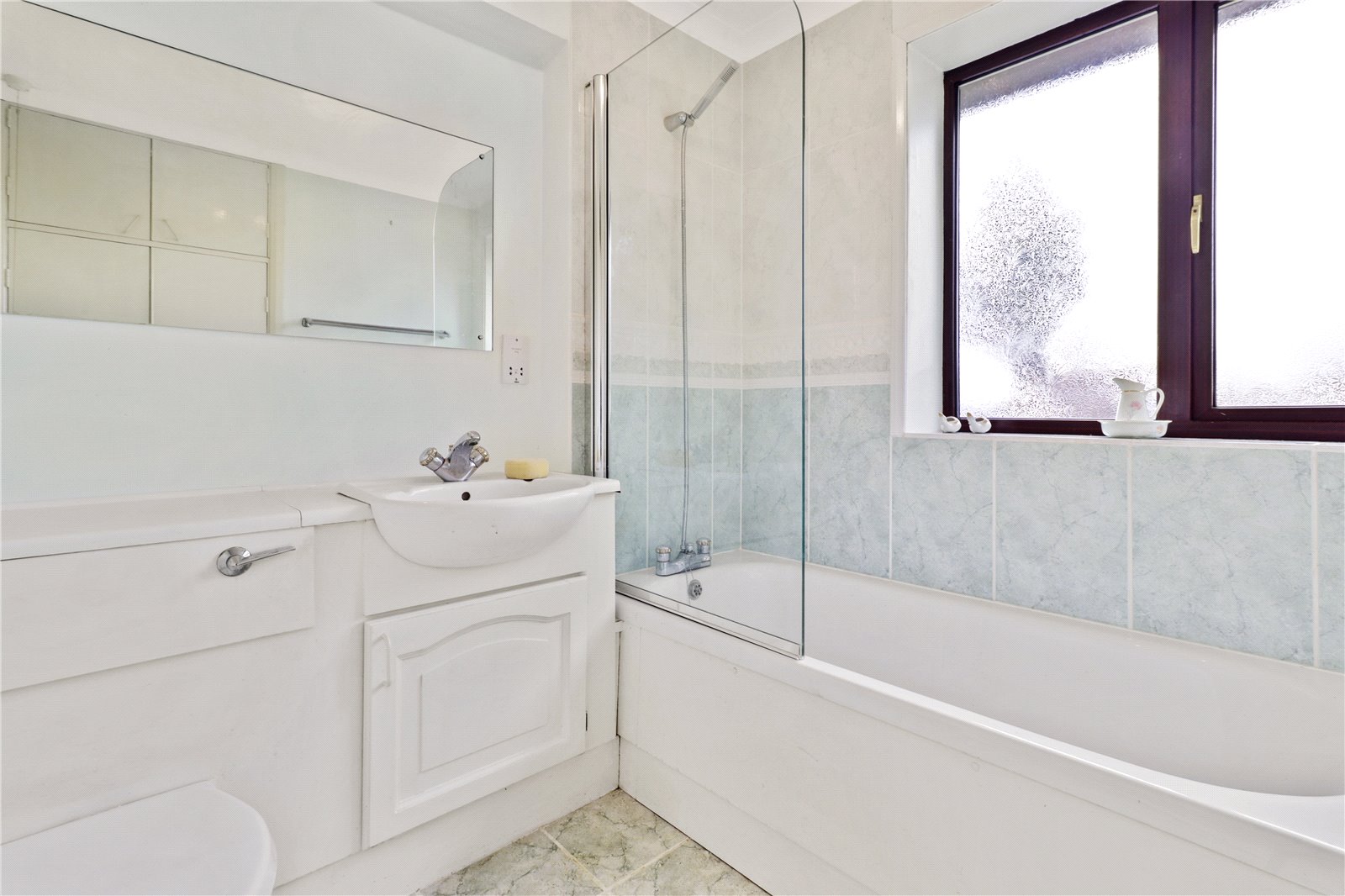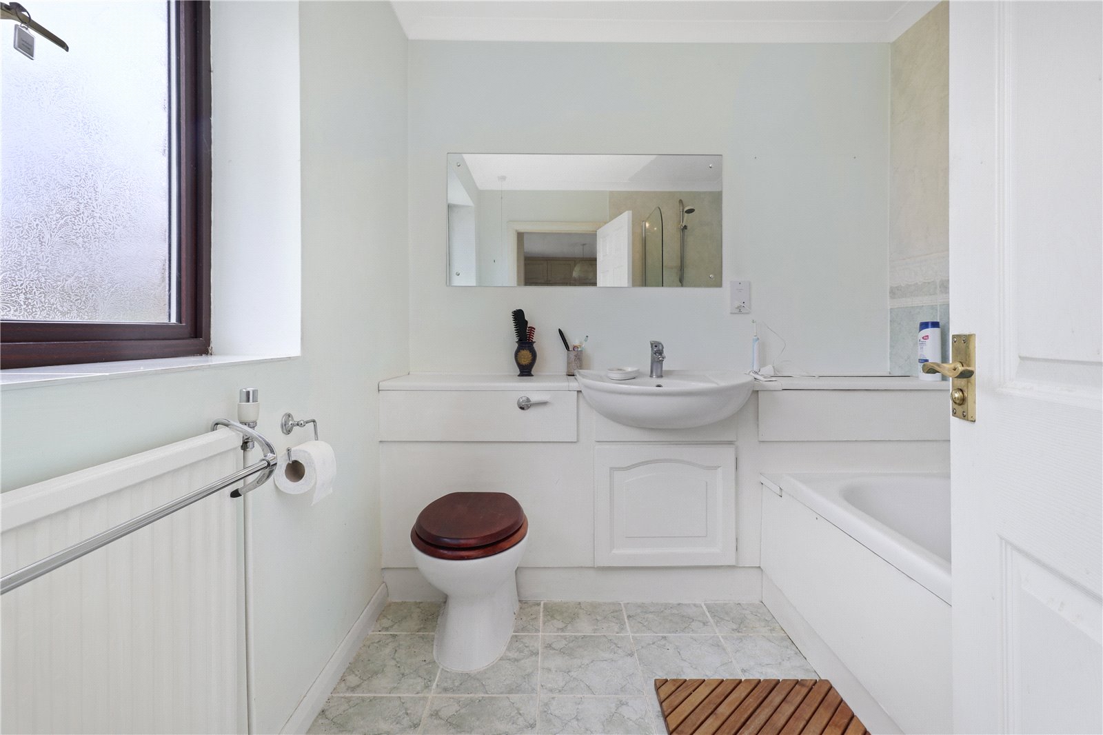ENSUITE BATHROOM / SHOWER ROOM FOR BEDROOM ONE: Comprising of a fitted bath with panelled side, tiled wall, tiled floors, heavy glazed shower screen to side, shower system, W.C., radiator, wash basin with chrome mixer tap and vanity areas to sides, wall mounted mirror, shaver point, radiator, double glazed window, coved ceiling.