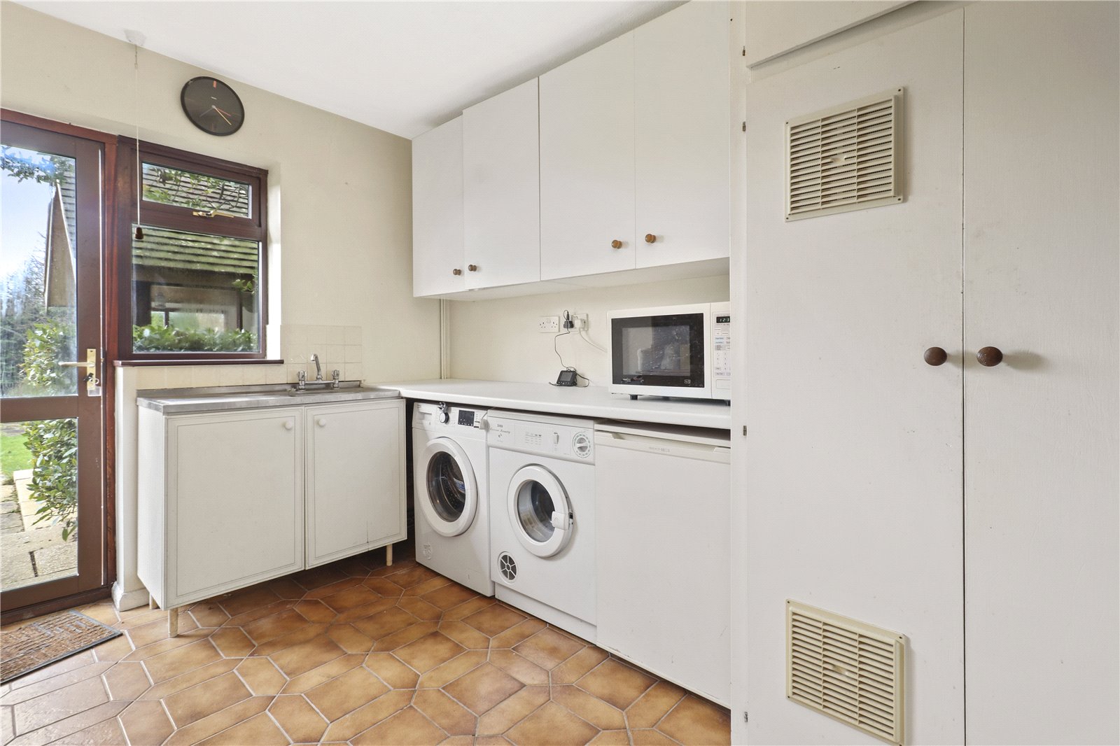 UTILITY ROOM: Approached from kitchen, the integral garage and from the rear garden, with a range of modern cupboard and base units with work surfaces over and fitted stainless steel sink unit, spaces under for washing machine, dryer and fridge freezer, further fitted cupboard housing boiler, tiled floor, ceiling light, double glazed window with aspect over the rear mature generous sized gardens.