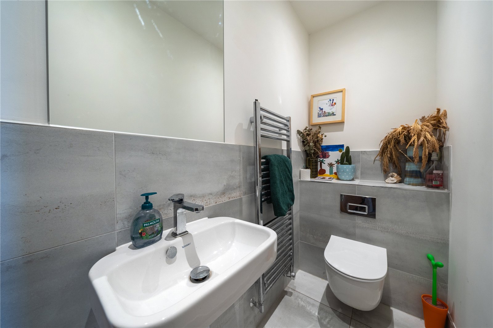 CLOAKROOM: Comprising of a W/C, chrome heated towel rail, wash basin, tiled floors and half tiled walls, down lights.
