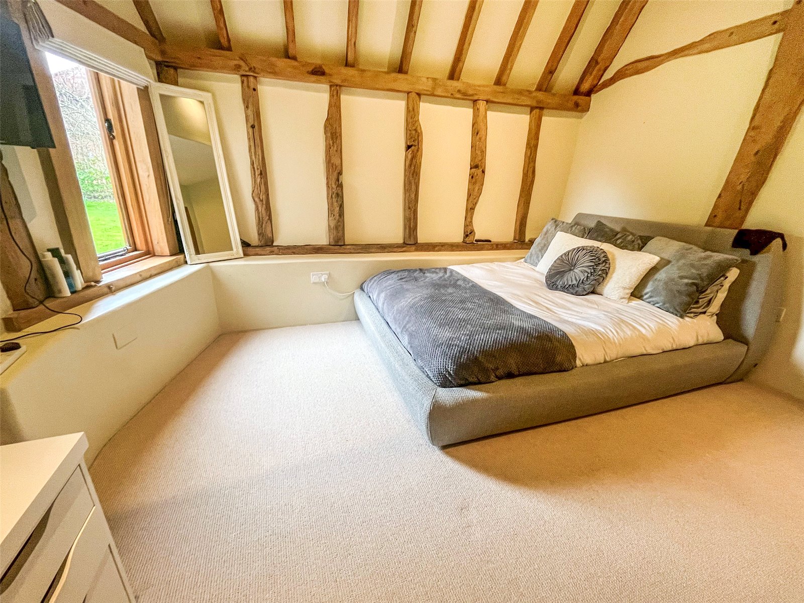 BEDROOM THREE: A double sized room with exposed beams to walls, further vaulted beamed ceiling, oak framed double glazed window with aspect over the garden.