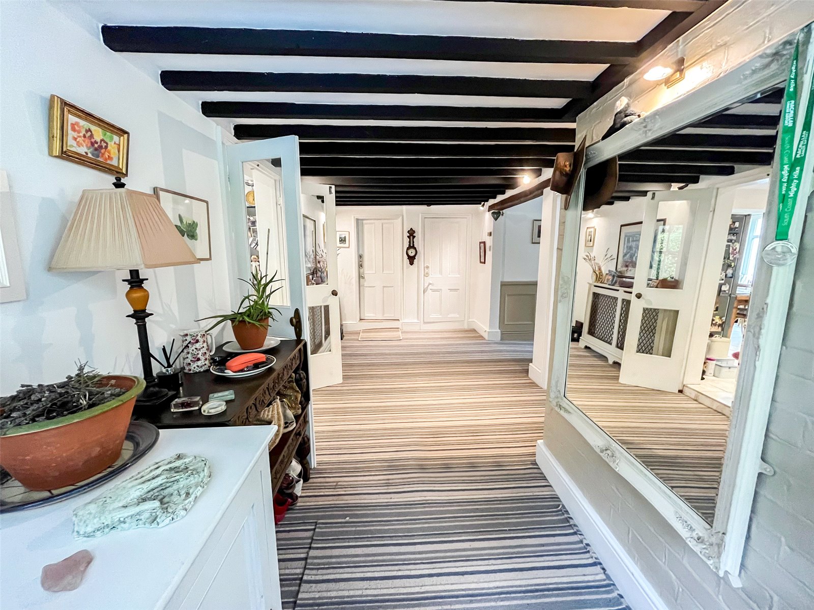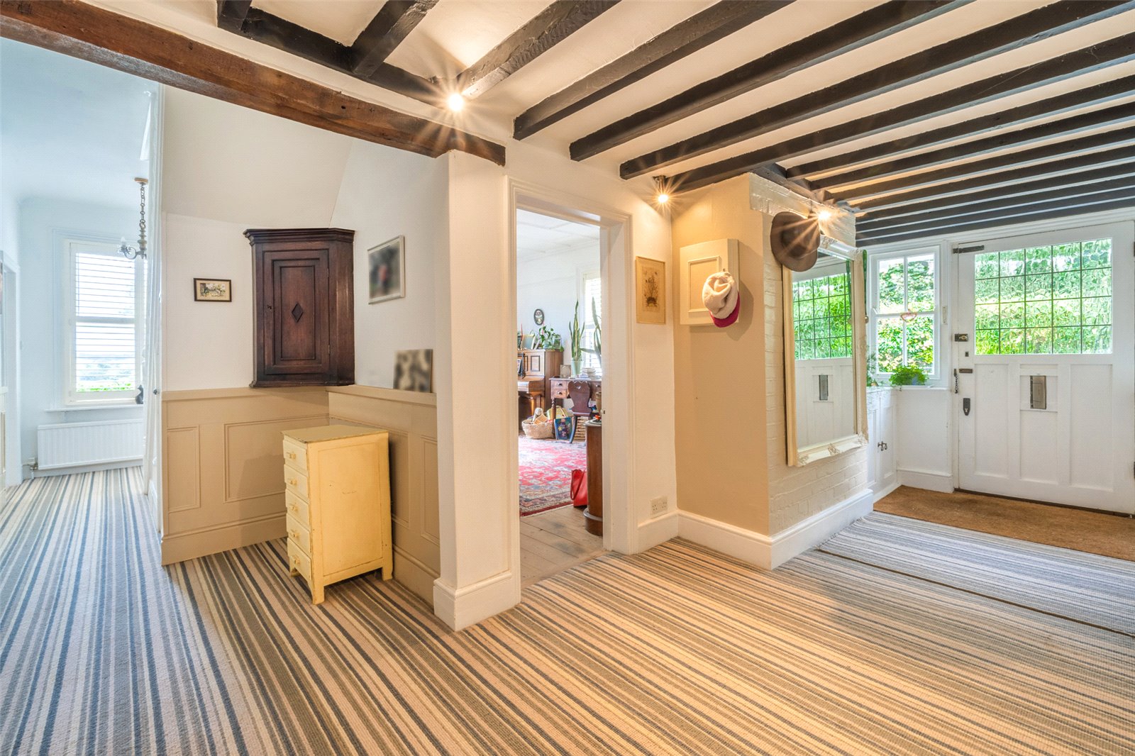 RECEPTION HALL: A large and naturally bright area with high level exposed beams to the ceiling, range of attractive fitted storage cupboards as you enter from outside, radiator, further extension of the main reception hall and doors leading off to the downstairs cloakroom, a sitting room, a family room, a kitchen / breakfast room / open plan dining room and the staircase leading to the first-floor accommodation.