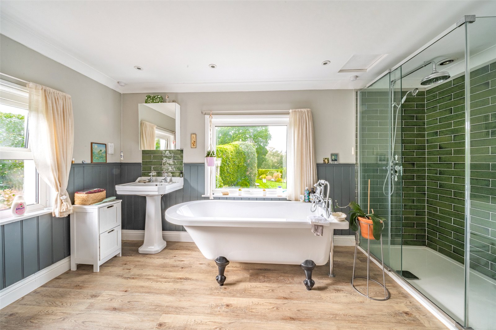 BEDROOM ONE LUXURY ENSUITE BATHROOM / SHOWER ROOM: Being a double aspect room that is naturally bright and beautifully enhanced to have a modern antique style rolltop bath on ball and claw feet and chrome mixer tap with shower attachment, twin antique styled wash basins with chrome taps, part tiled and part wood panelled walls, separate shower with heavy glazed front and tiled walls, chrome shower control system, large chrome shower head, airing cupboard, W.C., downlights, two chrome and white radiators / heated towel rails, double glazed windows with aspect over the side and rear gardens and the far reaching views of the countryside beyond.