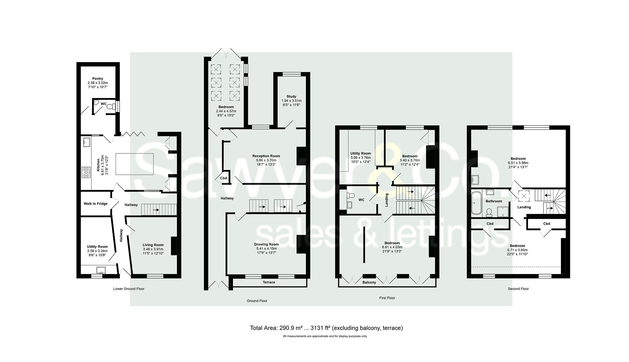 The first floor features a stunning principal bedroom with three sets of French doors leading to a full-length balcony, offering views over The Level. A second double bedroom with a built-in wardrobe, a utility room, and a large W/C complete this level.