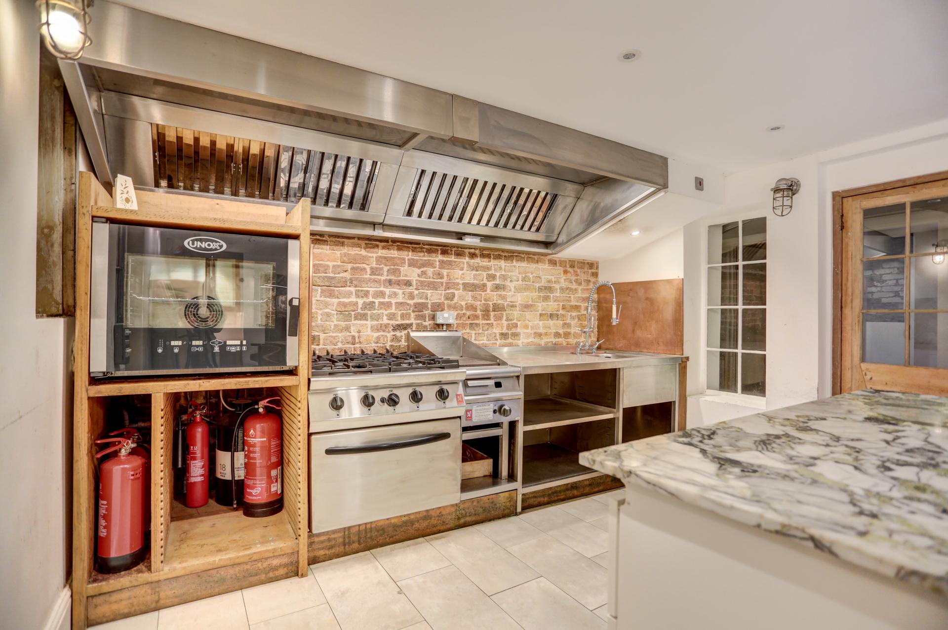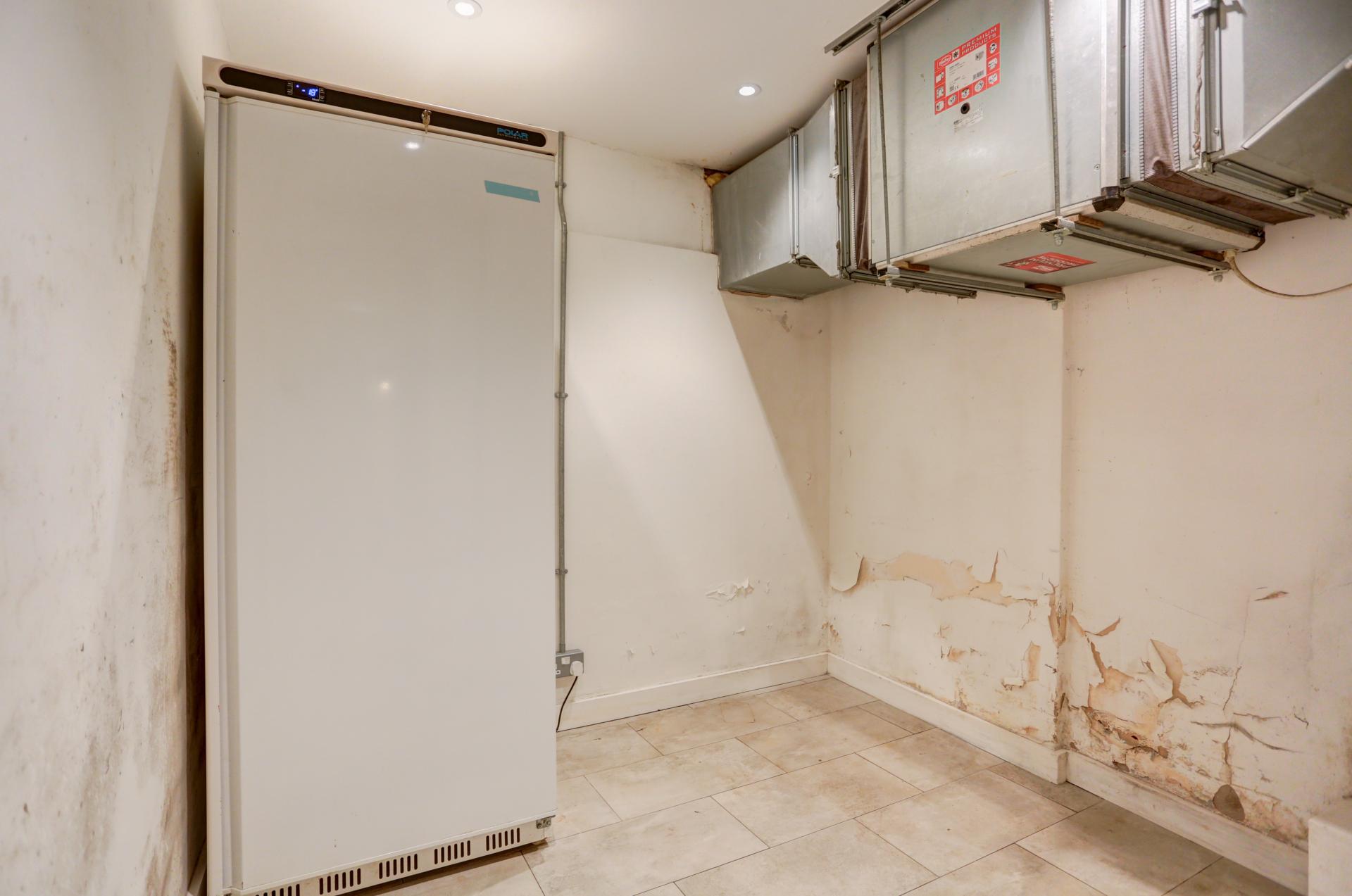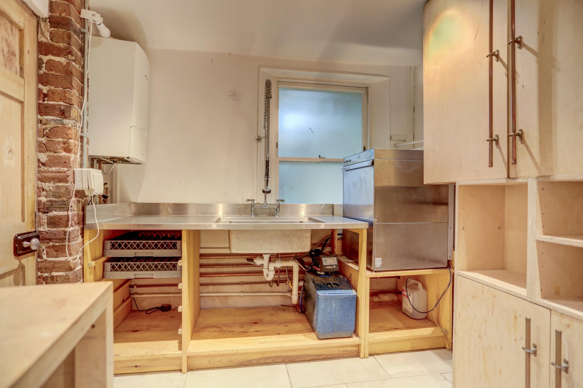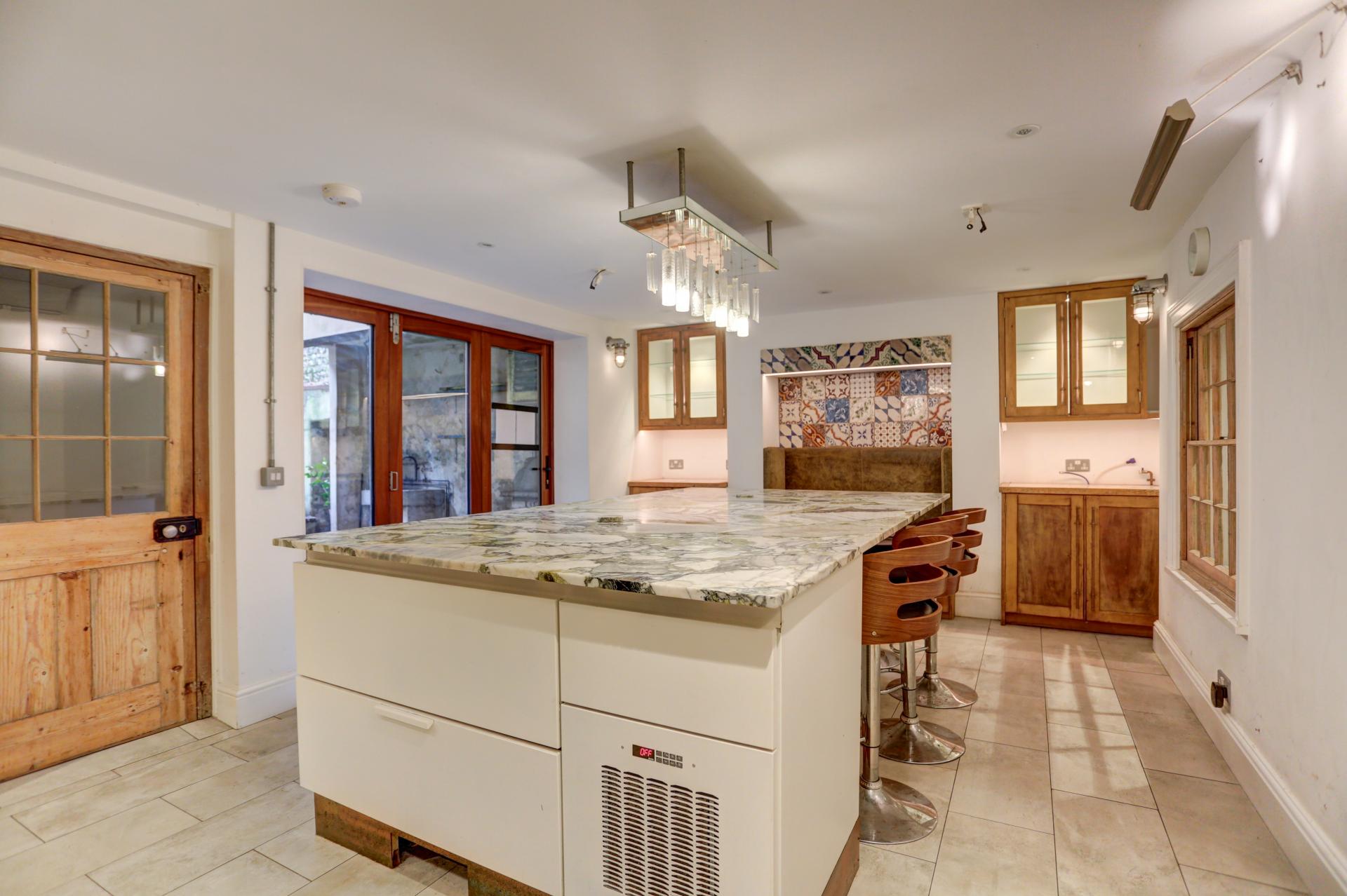 The lower ground floor benefits from a tastefully designed industrial-style kitchen with exposed brickwork, a central island, and ample built-in storage. This inviting space also includes an additional seating area and enjoys direct access to the rear garden via bi-folding glass doors. A walk-in pantry, W/C, and a walk-in fridge are conveniently located off the kitchen, while the hallway leads to a utility room and a good-sized living room.