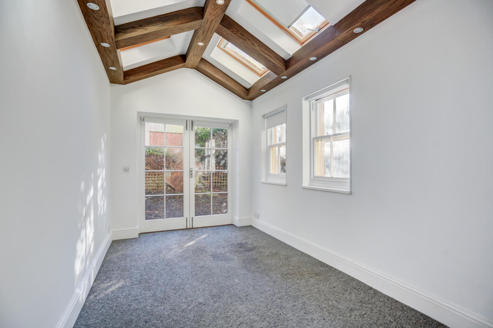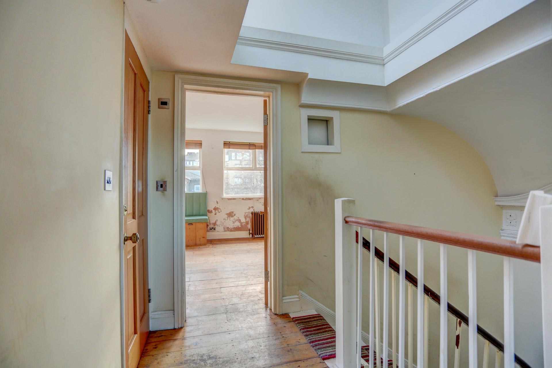 The ground floor hosts a bright and spacious drawing room that opens onto a west-facing balcony with elegant black iron railings. A second reception room, a study, and a beautifully presented double bedroom with six Velux windows-ideal as a dining room or additional reception room-complete this floor.
