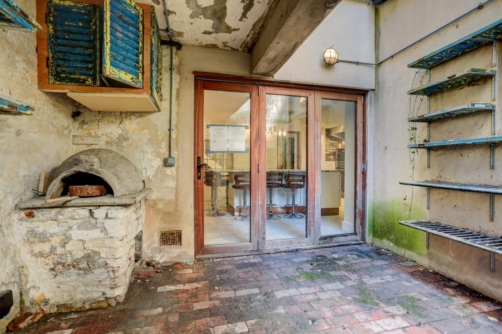 The tiered rear garden is a wonderful extension of the home, with an outdoor cooking area featuring a stone pizza oven, perfect for al fresco dining and summer gatherings.