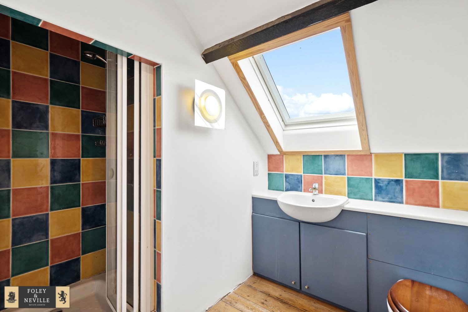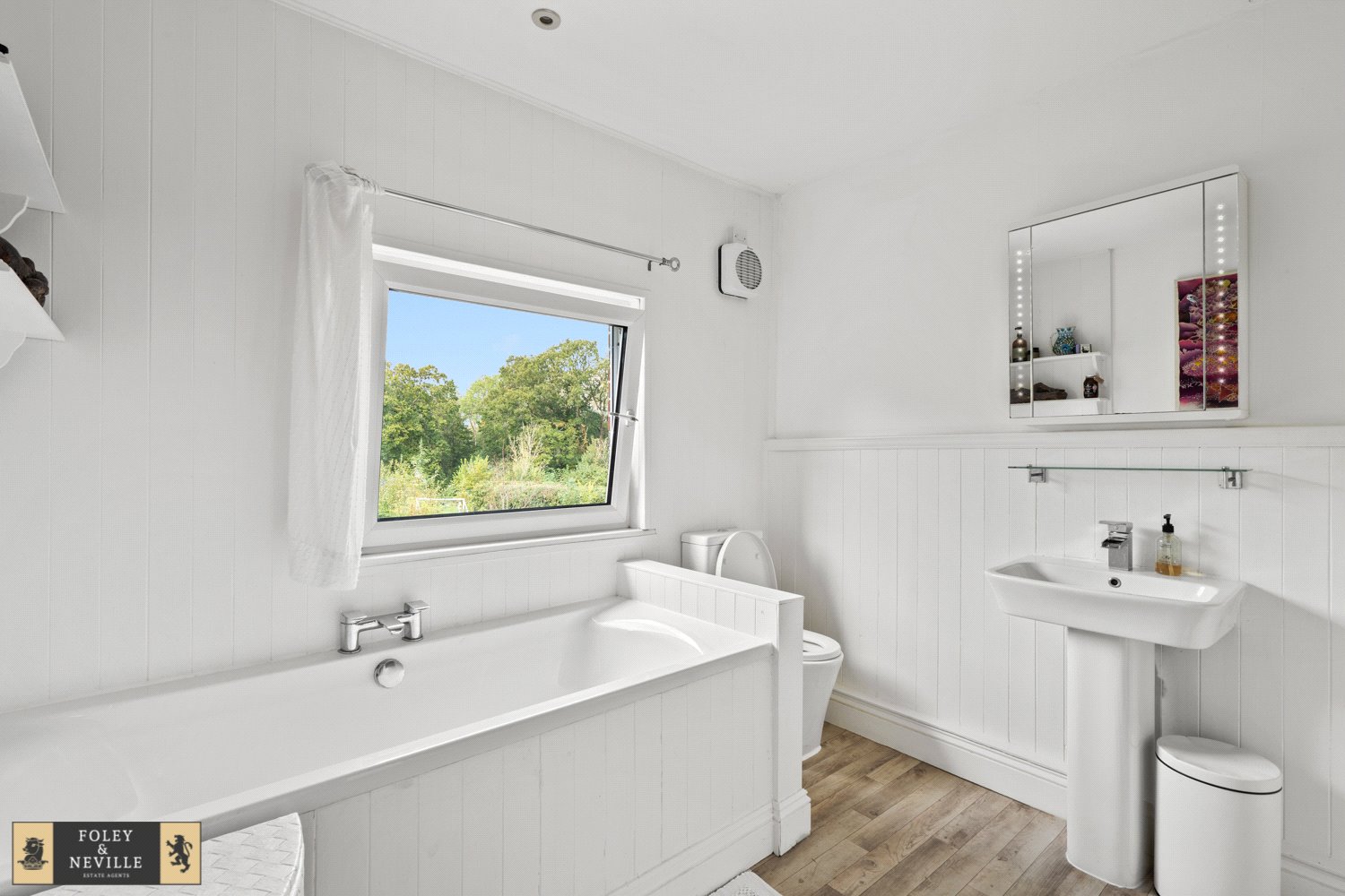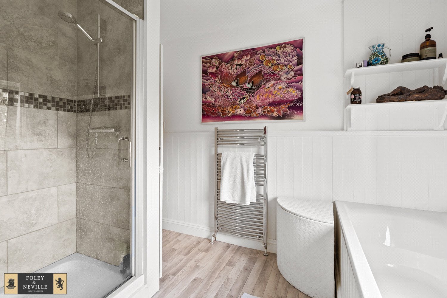 FAMILY BATHROOM / SHOWER ROOM: Comprising of a panelled bath, W.C., wash basin and separate shower with heavy glazed front, double glazed window, heated towel rail.