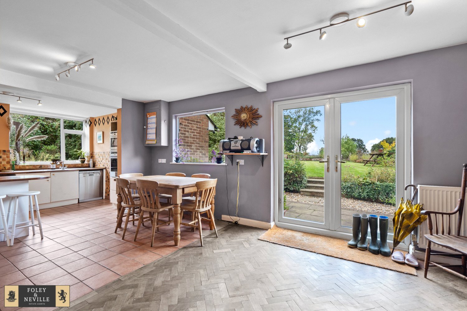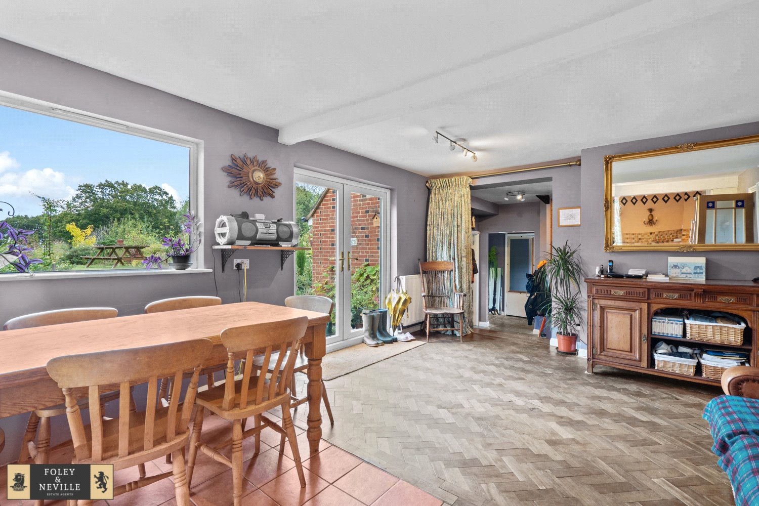OPEN PLAN DINING ROOM: A generous sized room with attractive old wooden floors, radiator, double glazed windows and door with aspect of rear gardens and country views beyond. Open plan area then expands into the adjoining kitchen / breakfast room area.