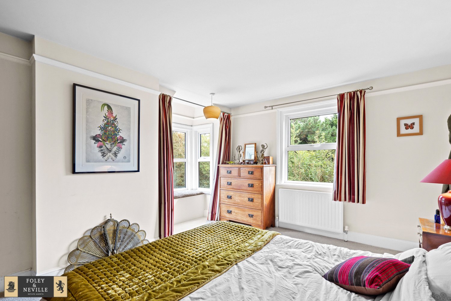 BEDROOM TWO: A double sized double aspect room with radiator, bay window and window seat with double glazing and aspect to front with some views beyond, further double-glazed window with aspect to front and rural views beyond.