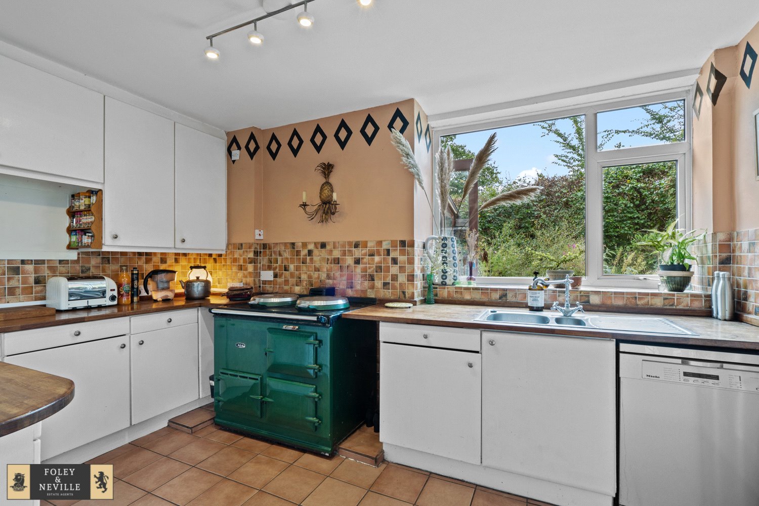 KITCHEN / BREKFAST ROOM: Also open plan and with a desirable feature AGA cooking range, a fitted sink unit with taps, range of cupboard and base units with worksurfaces over, space for dishwasher, space for other appliances, tiled surrounds, double glazed window