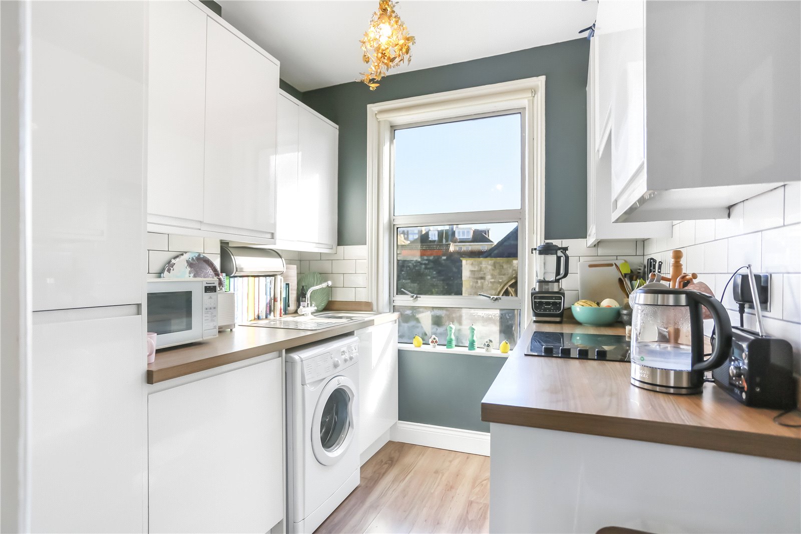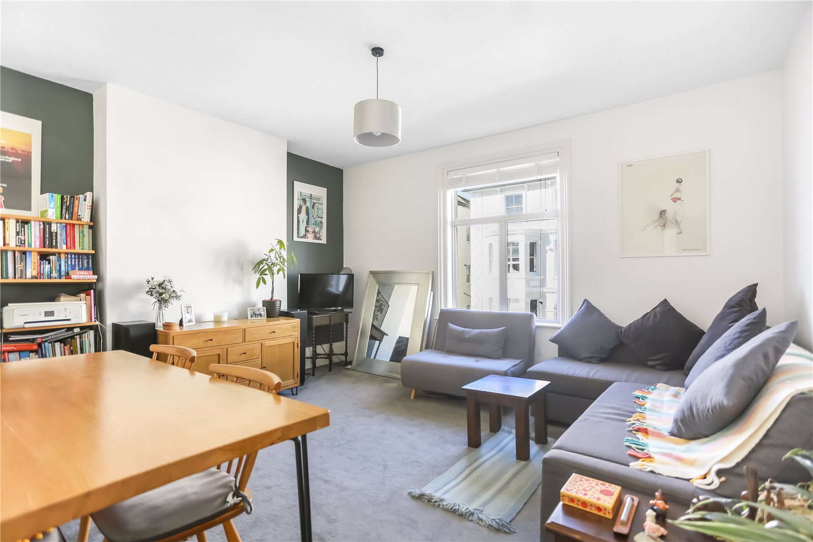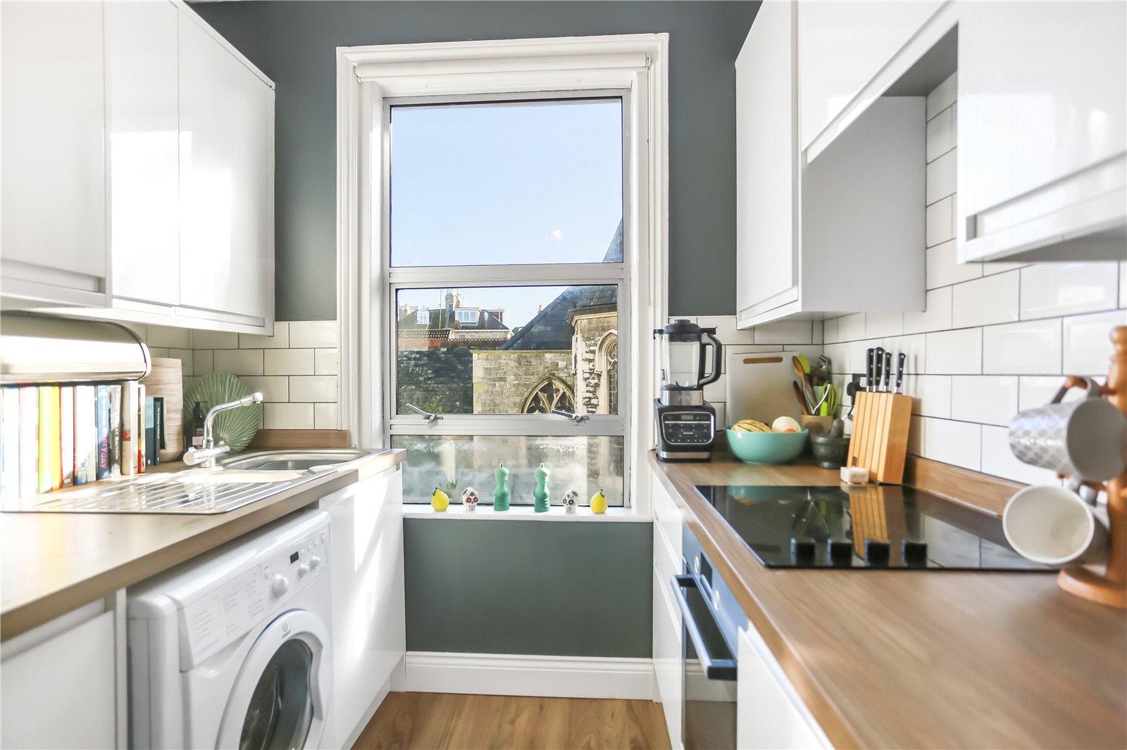 Situated on the first floor of an attractive Victorian building, the property is beautifully presented and well-proportioned throughout. The west-facing living room is particularly spacious and bright, benefiting from an abundance of natural light during the afternoon. The contemporary kitchen is finished to a high standard, featuring sleek white cabinetry. The property also includes a modern shower room with an electric shower and a separate W/C. The generously sized double bedroom, facing east, enjoys plenty of morning sunlight through a bay window making this room exceptionally bright.