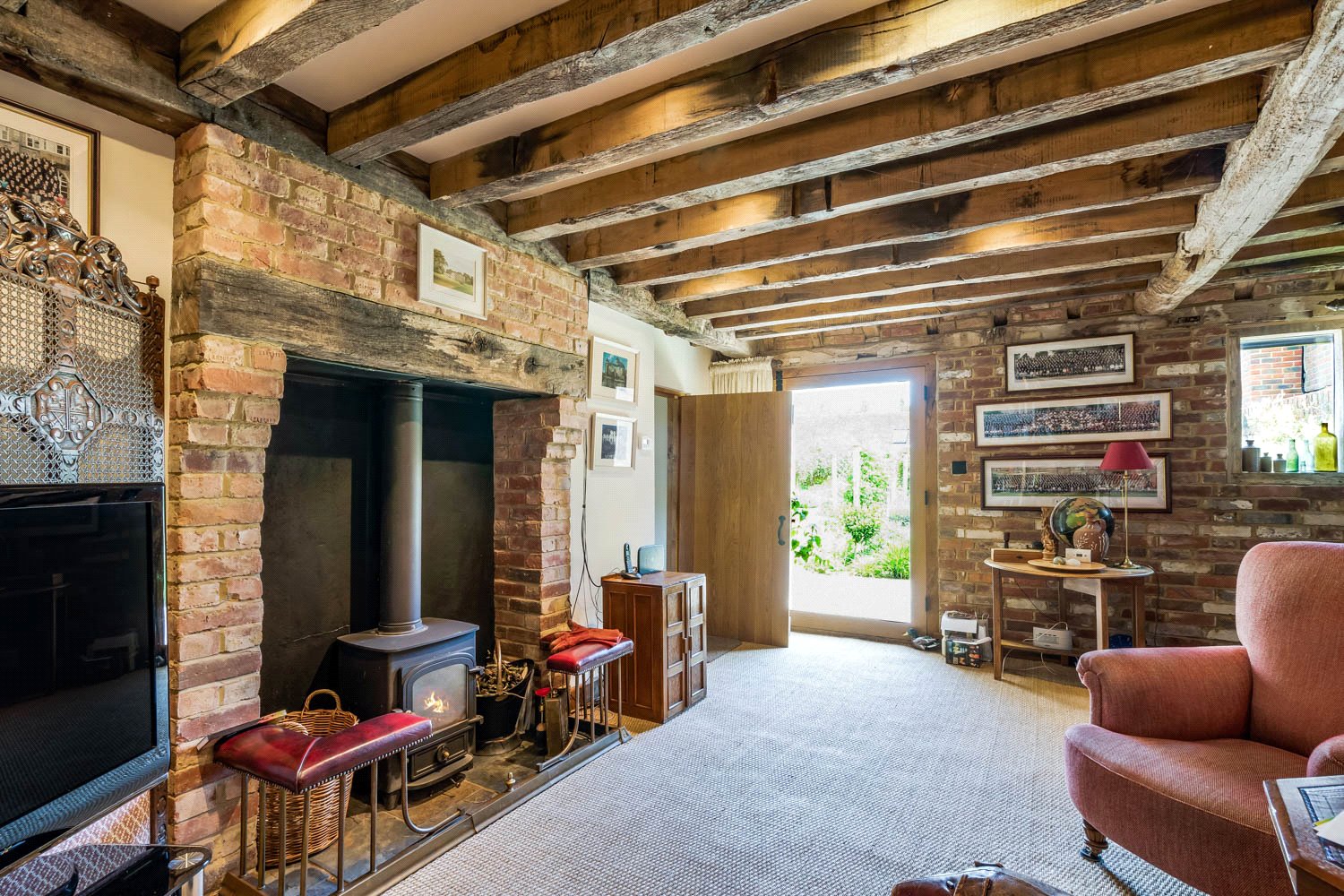 LIBRARY / SNUG ROOM: With a feature brick inglenook fireplace with fitted wood burner, slate hearth, beamed ceiling, fitted bespoke bookshelves, under floor heating, hatch to storage loft area with retractable ladder, oak framed double glazed door leading to Mediterranean style courtyard garden.