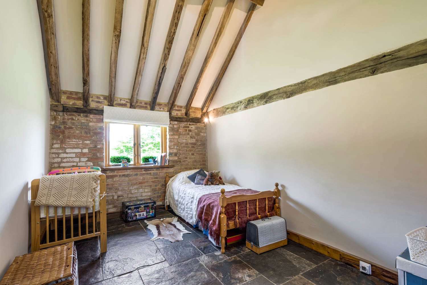 BEDROOM SIX: A double sized room with slate floor and under floor heating, vaulted beamed ceiling, double glazed oak framed window with aspect to side garden and beyond of the countryside and paddocks.