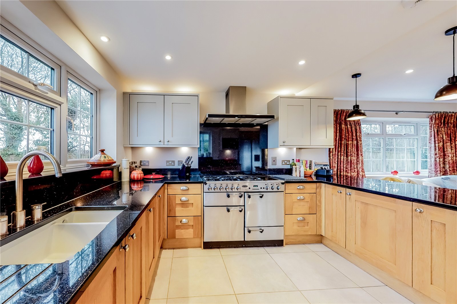 KITCHEN AREA: Comprising of a high quality fitted kitchen with range of light oak and painted cupboard and base units with dark marble reflective fleck work surfaces over, fitted integral Bosch dishwasher, inset 1 ½ drainer sink unit with brushed steel mixer tap, dark marble reflective fleck plash backs, fitted gas brushed steel five ring gas hob Range Master with additional electric hot plate and dark marble reflective fleck rear wall back and brushed steel extractor hood over, fitted eye level Bosch microwave, fitted twin wine racks, space to incorporate a large American Fridge Freezer, attractive large light coloured tiled flooring with underfloor heating, double glazed windows with aspect to the front and far reaching views beyond.