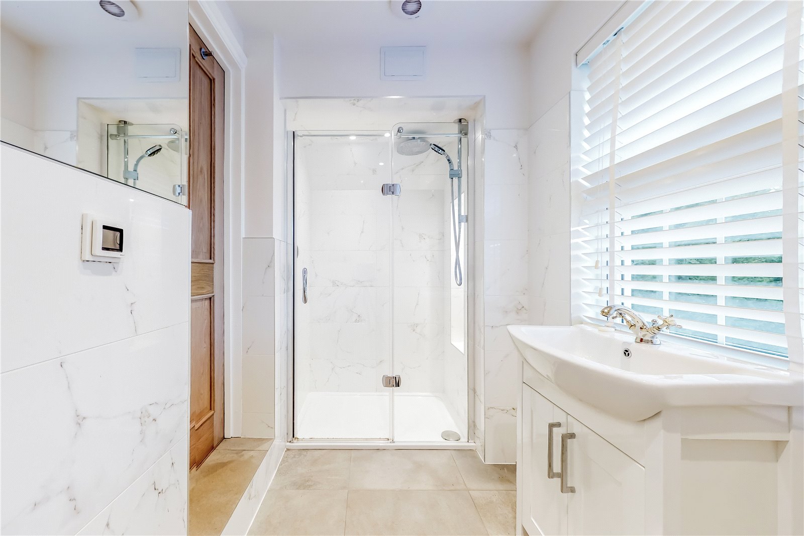 EN-SUITE SHOWER ROOM: Steps to large tiled floor with underfloor heating, attractive marble effect tiled walls with further tiled display and storage shelf, quality white ceramic wash basin with chrome tap and cupboard under, wall mirrors, wall mounted heated chrome towel rail, glazed fronted double sized recessed shower cubicle with chrome shower control system and large chrome shower head, further handheld shower attachment, double glazed window.