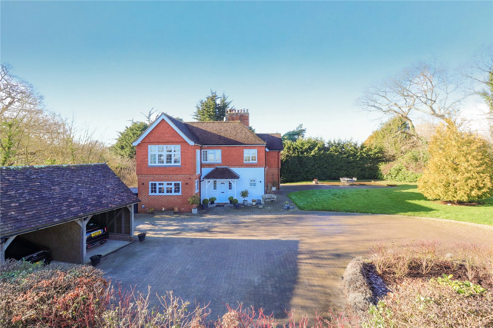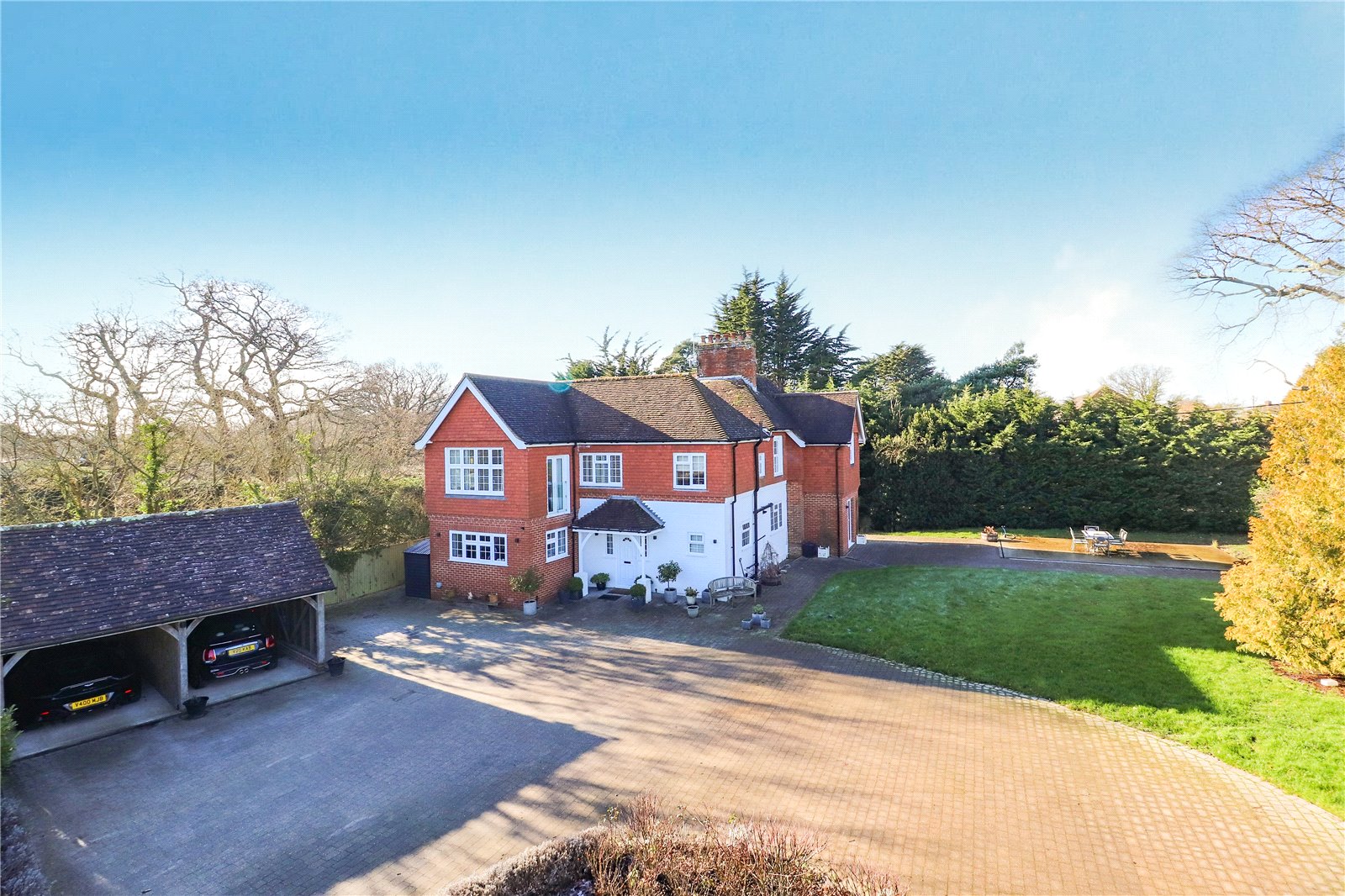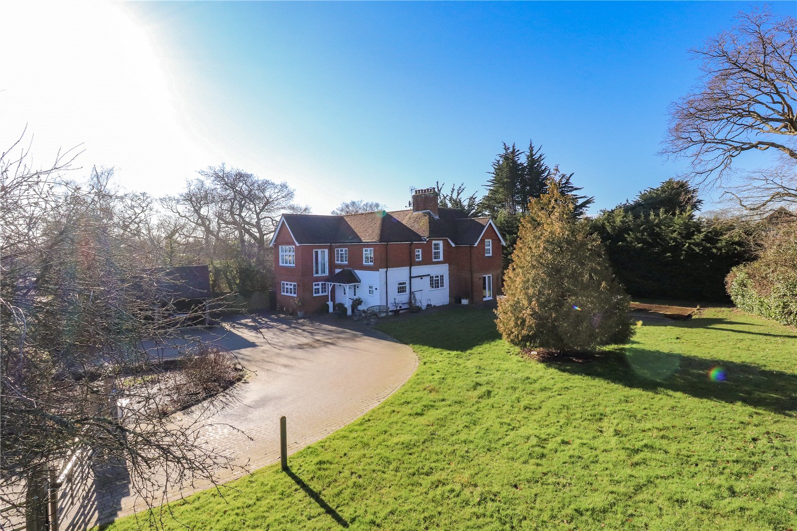 Outside the property benefits from a detached double heritage style garage, a large aesthetically pleasing brick paved driveway and further extensive parking areas, as well as similar paved sun terraces and pathways, well-manicured level lawns that extend to 0.8 of an acre and a private gated electric security entry system.