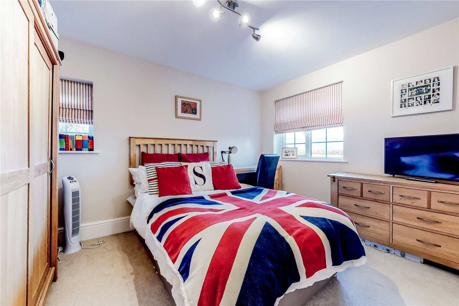 BEDROOM THREE: Approached by panelled light coloured oak door and comprising of a radiator, brushed steel ceiling light, double glazed window with aspect over rear garden and further double-glazed window over side garden.