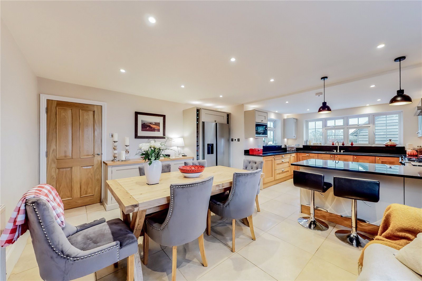 OPEN PLAN KITCHEN BREAKFAST ROOM AND FAMILY DINING ROOM: Approached by an elegant light oak panelled door from the entrance hall.
