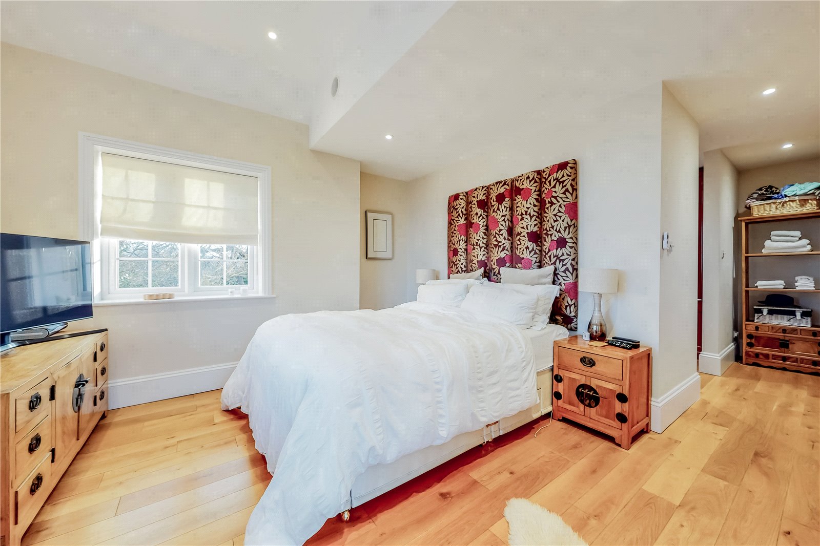 DRESSING ROOM: Approached from inside the main bedroom by an open doorway and comprising of a continuation of the attractive oak flooring, twin full height fitted range of wardrobe and display cupboards, wall mirror, radiator, double glazed window with aspect to side garden and distant views beyond.