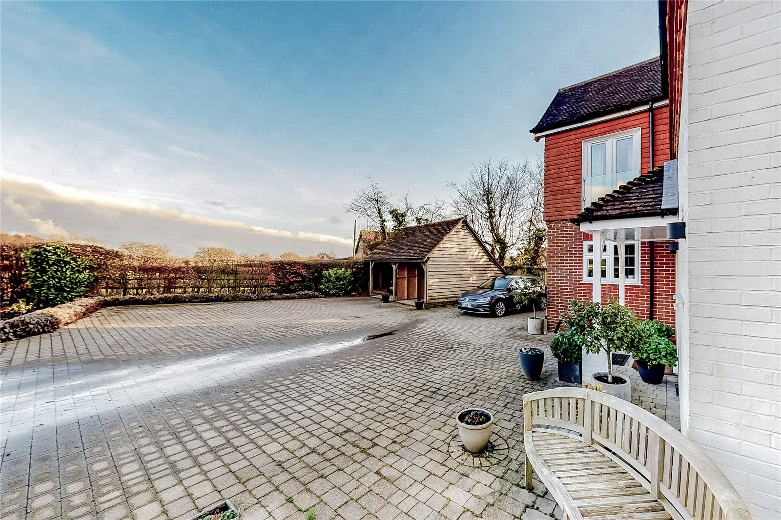 OUTSIDE: The farmhouse enjoys wonderful far reaching rural views and is approached off a private lane by an impressive brick paved drive that leads through an electric security gated system. The extensive brick paved driveway offers a generous turning area and additional parking for numerous vehicles.