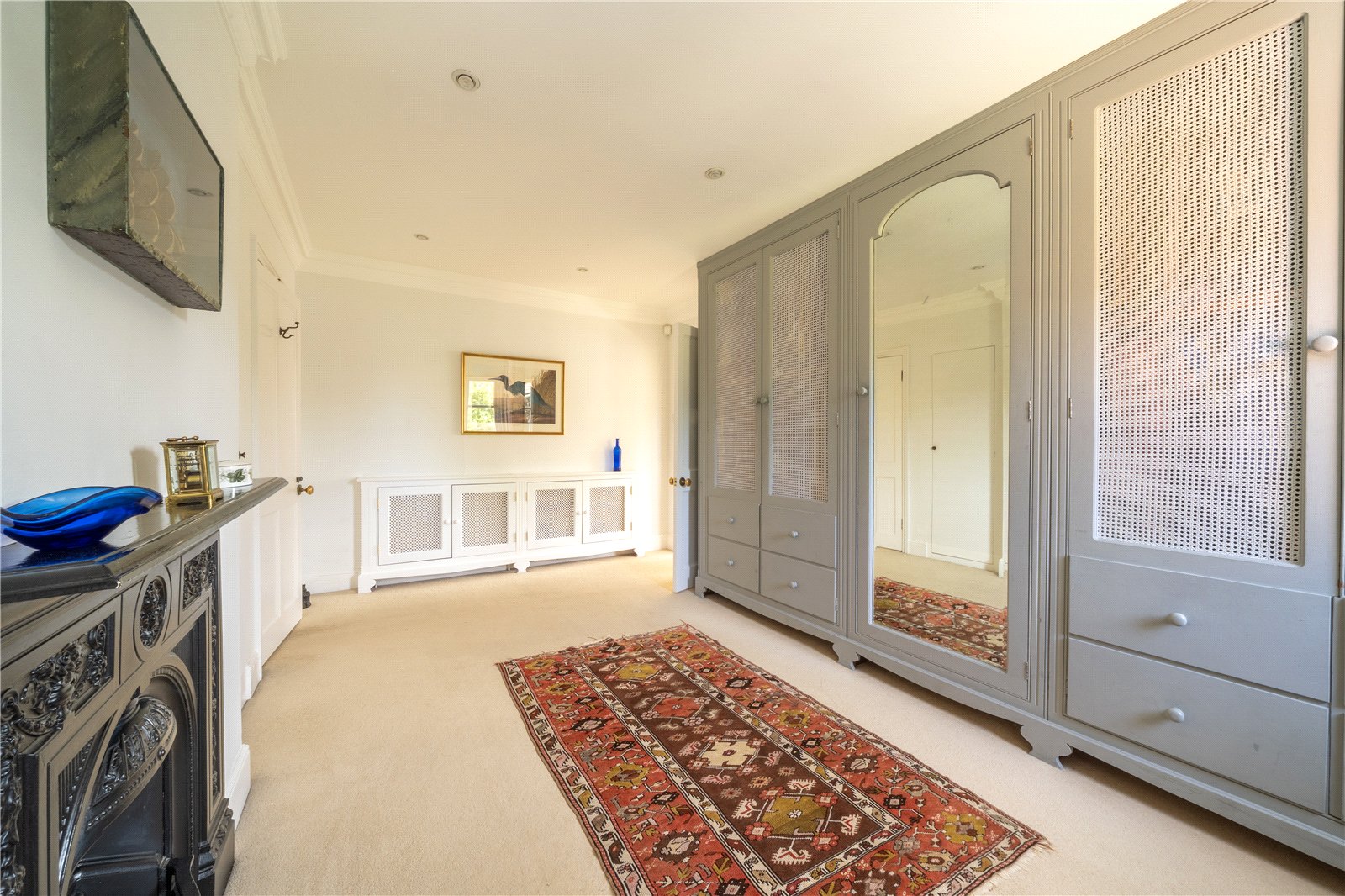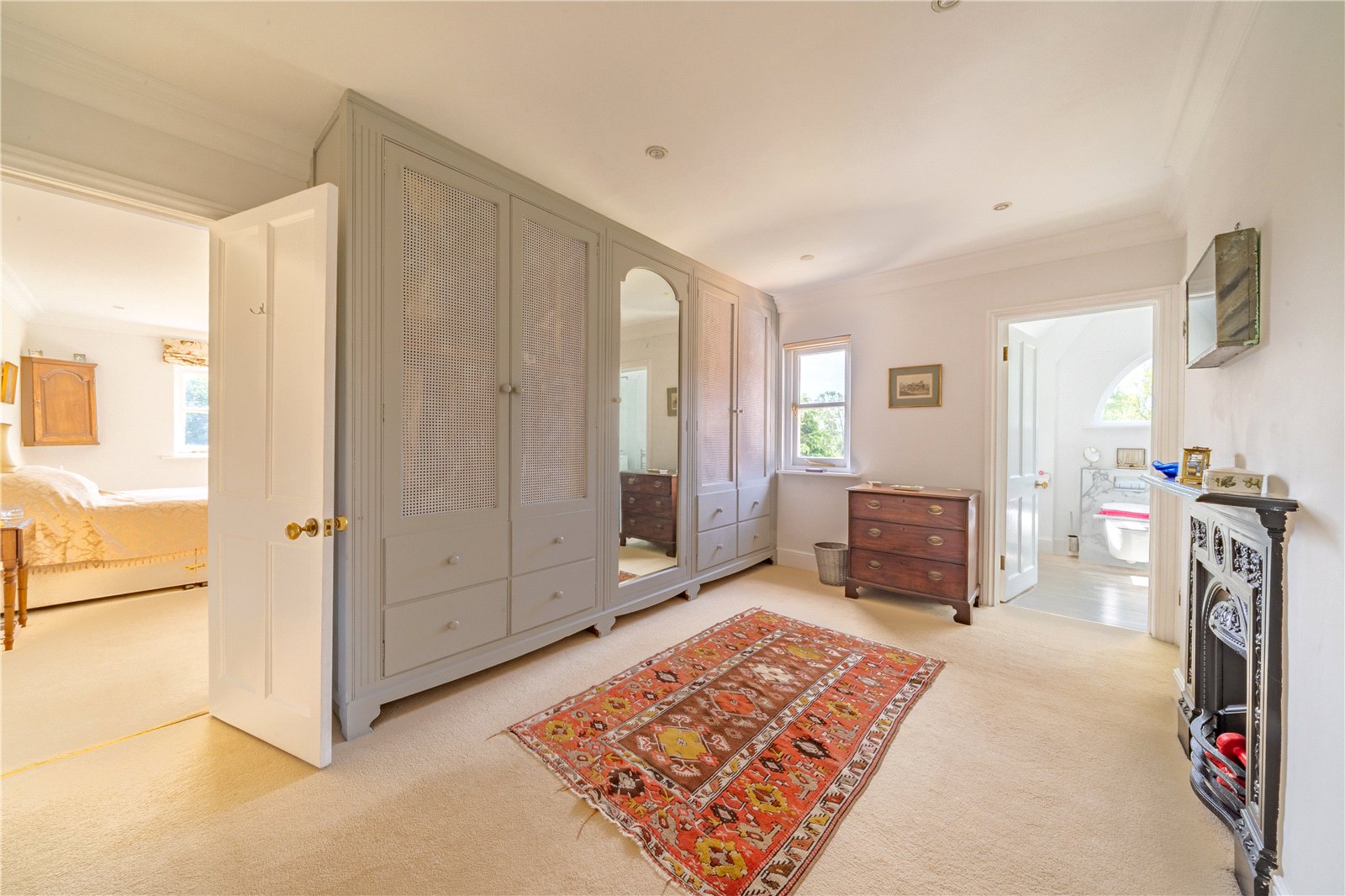 DRESSING ROOM: Adjoining the bedroom, the dressing room/walk-in wardrobe provides extensive fitted storage with bespoke cabinetry, mirrored fronts, and additional built-in units, ensuring both practicality and style. A feature cast-iron fireplace adds character, while the room offers an ideal transition between the bedroom and en-suite.