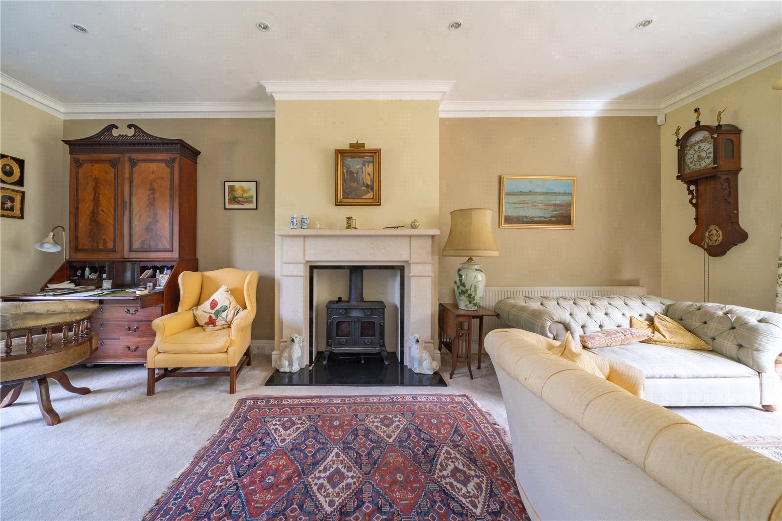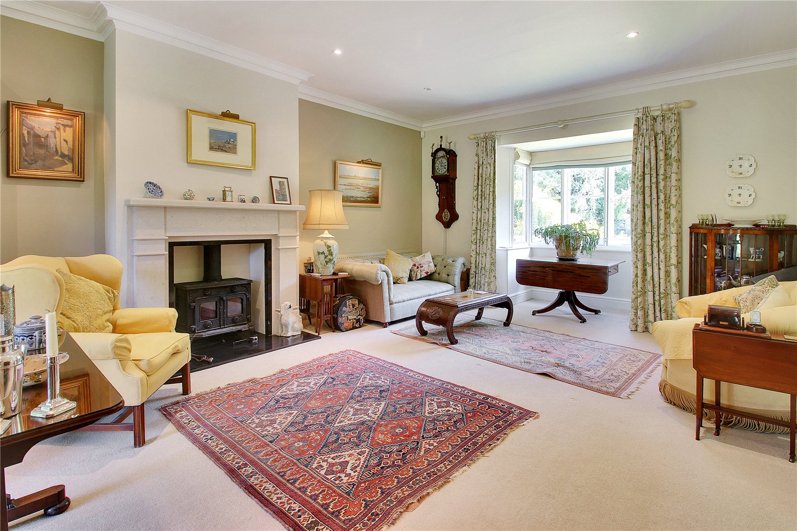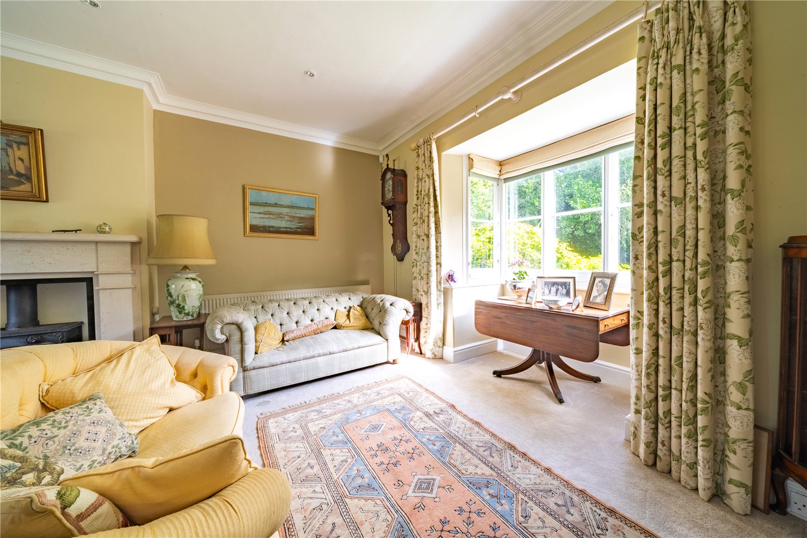 SITTING ROOM: The sitting room is a wonderfully elegant and inviting space, enjoying an abundance of natural light from the double aspect large bay and French windows that frame views across the landscaped gardens. Centred around a handsome stone fireplace with wood-burning stove, the room combines traditional charm with generous proportions, creating a perfect setting for both everyday living and entertaining. Classic details such as high ceilings with decorative cornicing, full-height curtains, and two feature fireplaces enhance the sense of character, while the versatile layout allows for distinct seating. With garden access and ample room for a variety of furnishings, this is a warm and welcoming heart of the home.