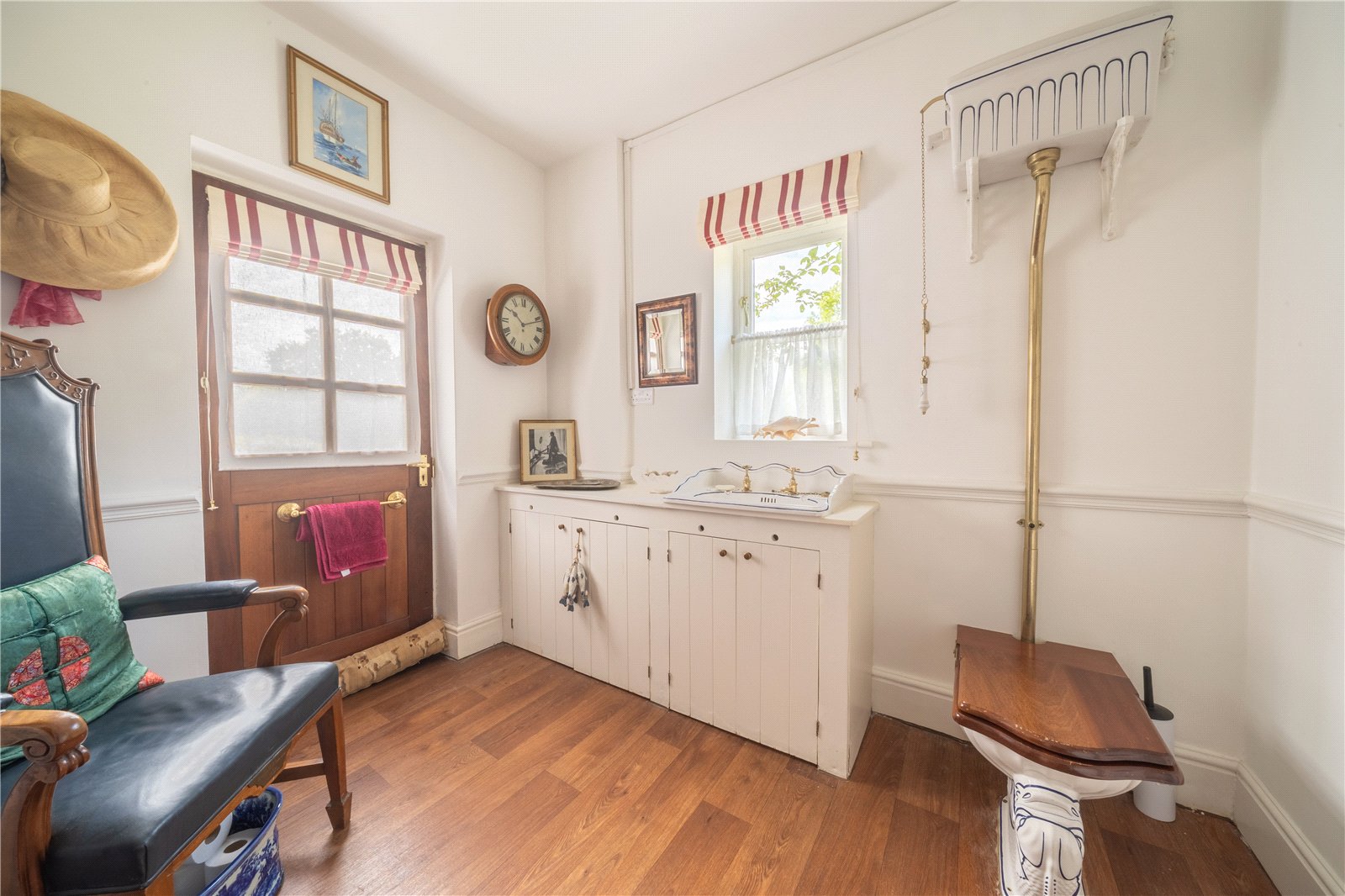 DOWNSTAIRS WC: The downstairs WC is full of character, featuring a traditional high-level cistern with pull chain and a hand-painted ceramic basin. Natural light streams in through a side window, while the imitation wooden flooring and half-panelled walls add to the cottage charm. Practical built-in storage is neatly fitted beneath the sink, and a stable-style door provides access to the outside, making this a functional and distinctive cloakroom with plenty of period appeal.
