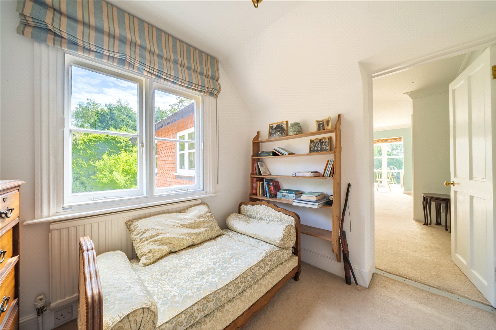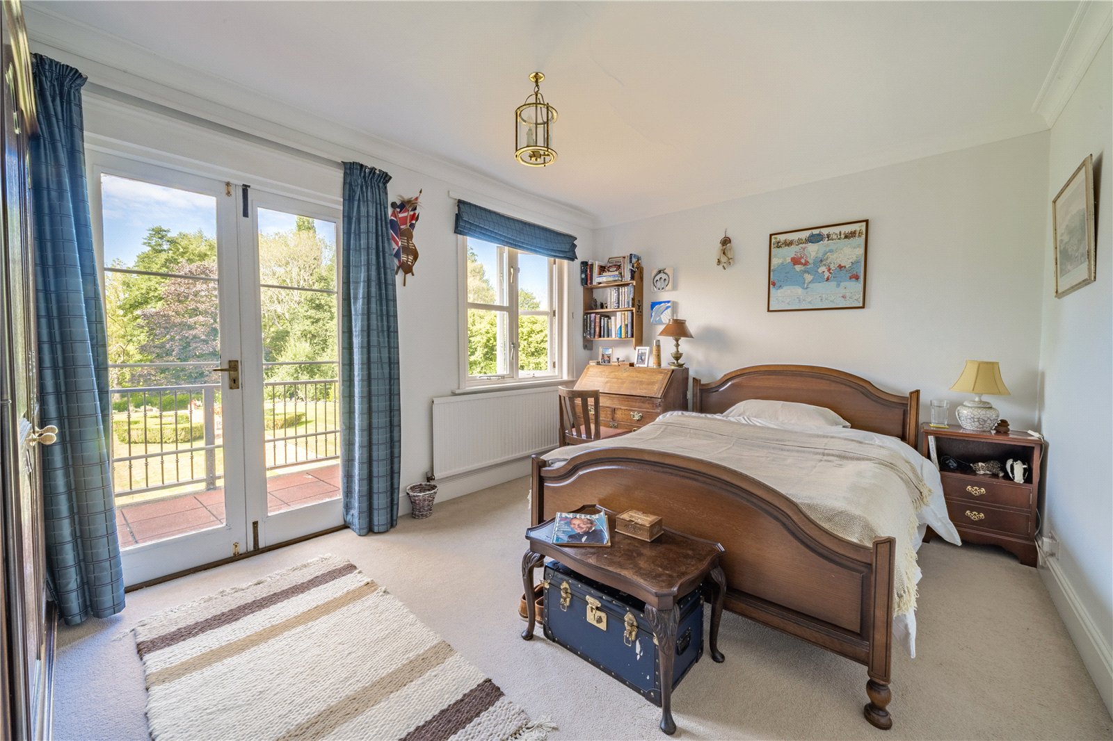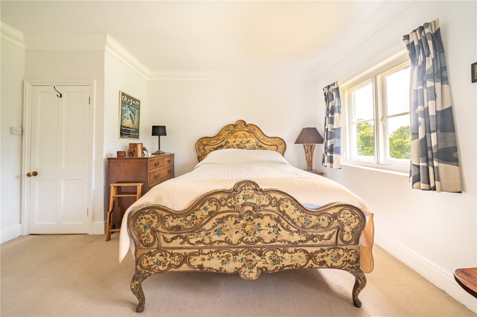 BEDROOM 2: This bright and well-proportioned bedroom enjoys a wonderful outlook over the gardens, with French doors opening onto a balcony that enhances the sense of light and space. Neutral décor and generous proportions create a calm and inviting atmosphere, while the room comfortably accommodates a double bed and additional furnishings. Perfect as a guest bedroom, family room, or peaceful retreat, it combines practicality with charm, making the most of its elevated position and garden views.