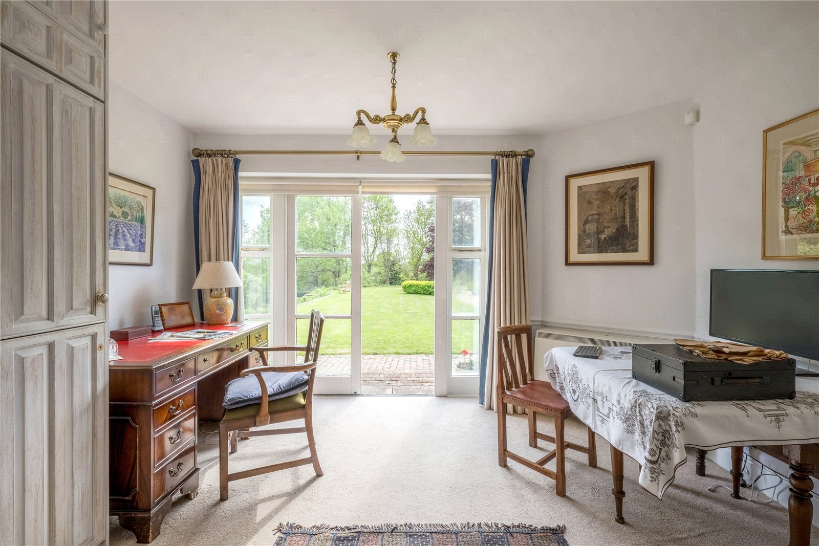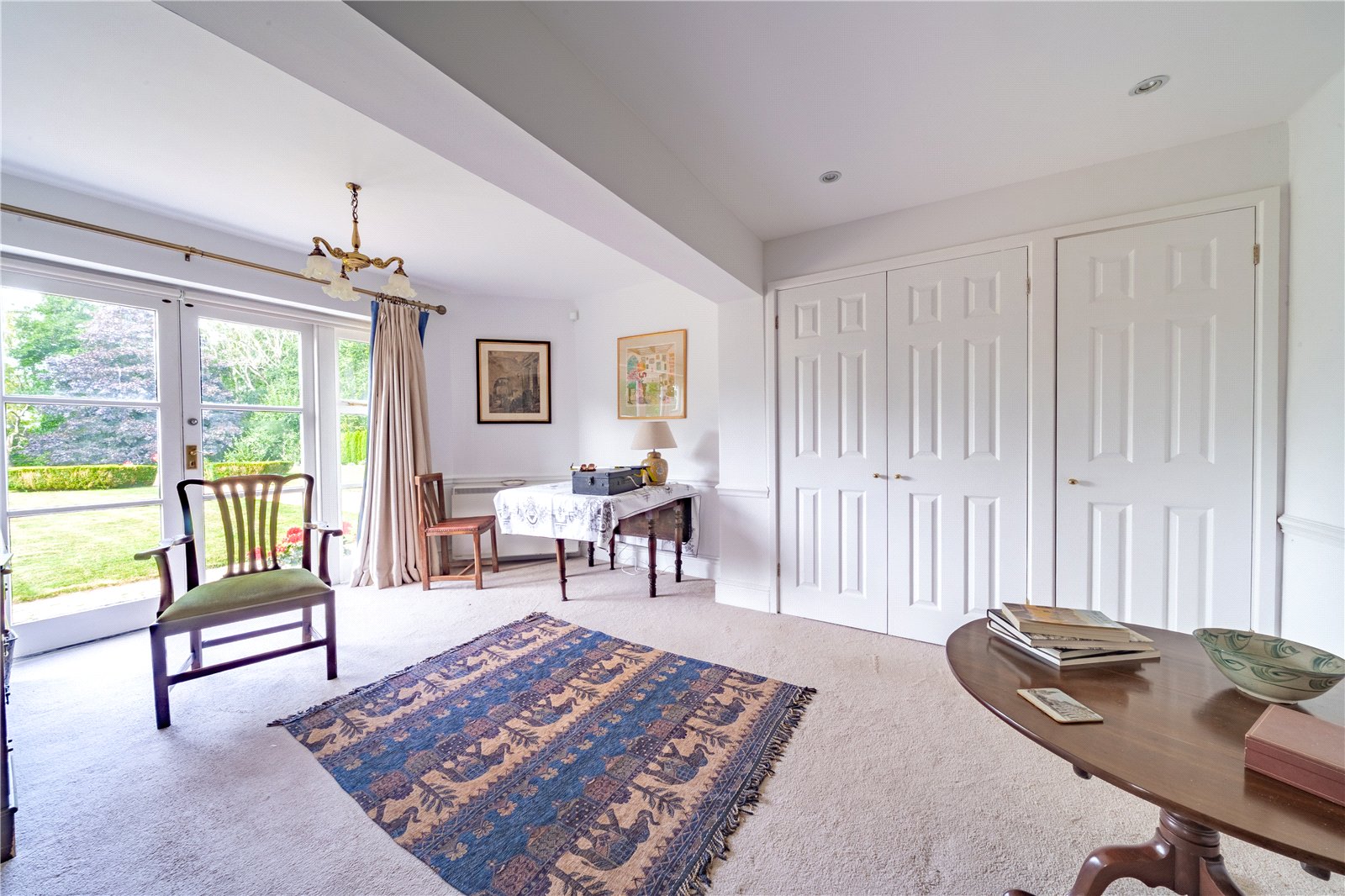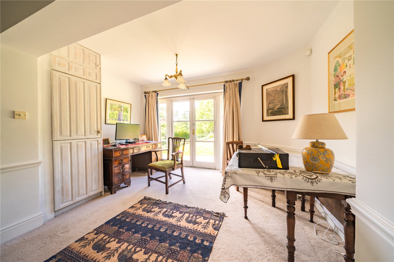 STUDY: The study is a bright and versatile room, ideal for home working or quiet reading. French doors open directly onto the gardens, filling the space with natural light and offering lovely views. The room is well-proportioned with fitted storage cupboards, ample space for desks and shelving, and a neutral décor that enhances the sense of light and calm. Perfectly suited as a home office, library, or hobby room, it combines practicality with a peaceful outlook.