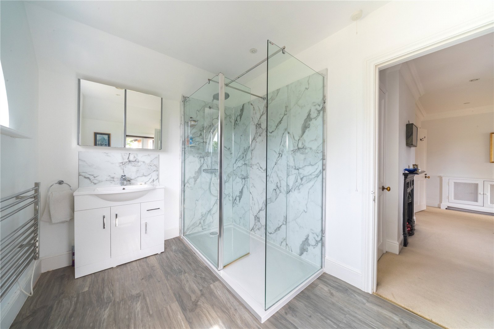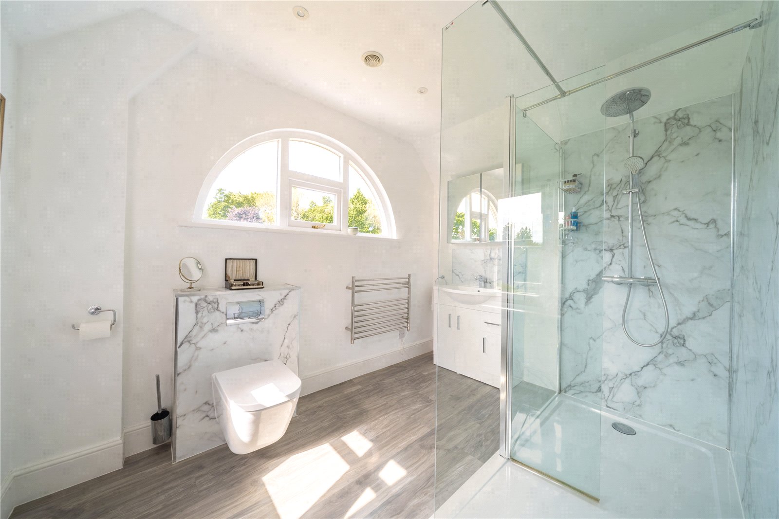 EN-SUITE: The en-suite bathroom has been beautifully designed with a contemporary finish, featuring a large walk-in shower with marble-effect tiling, a sleek vanity unit with inset basin and illuminated mirror, a modern WC, and a heated towel rail. A striking, large lunnette window floods the room with light, enhancing the sense of space and luxury.