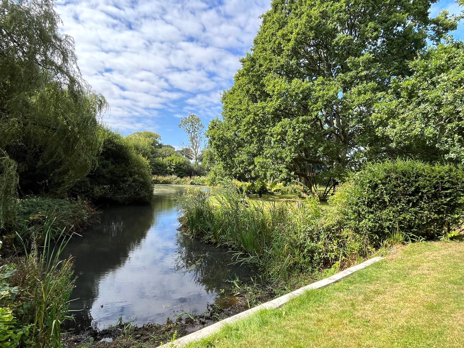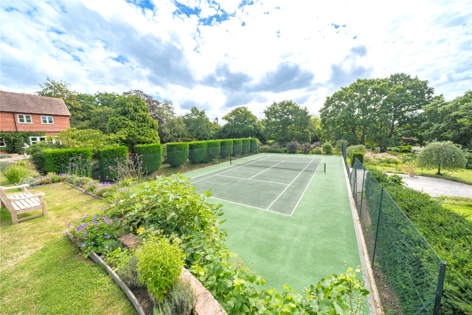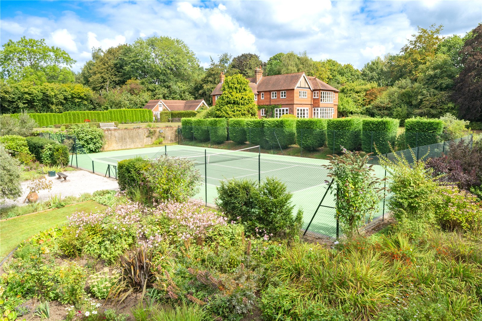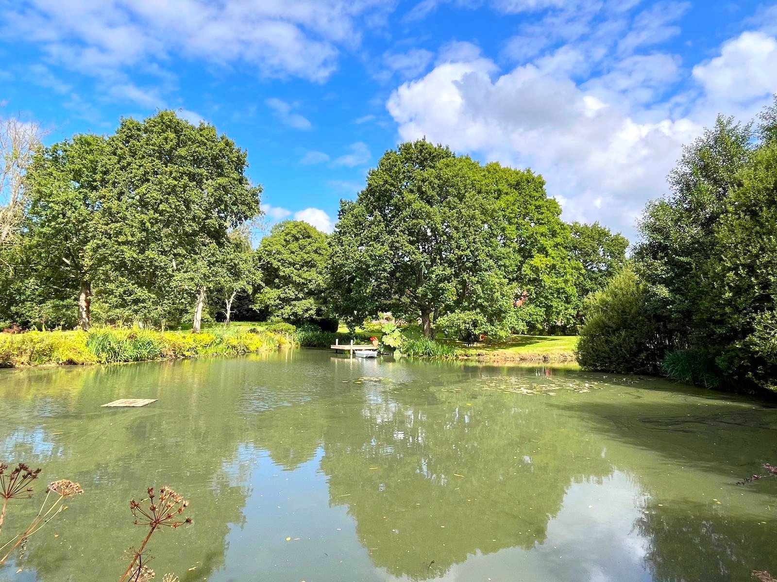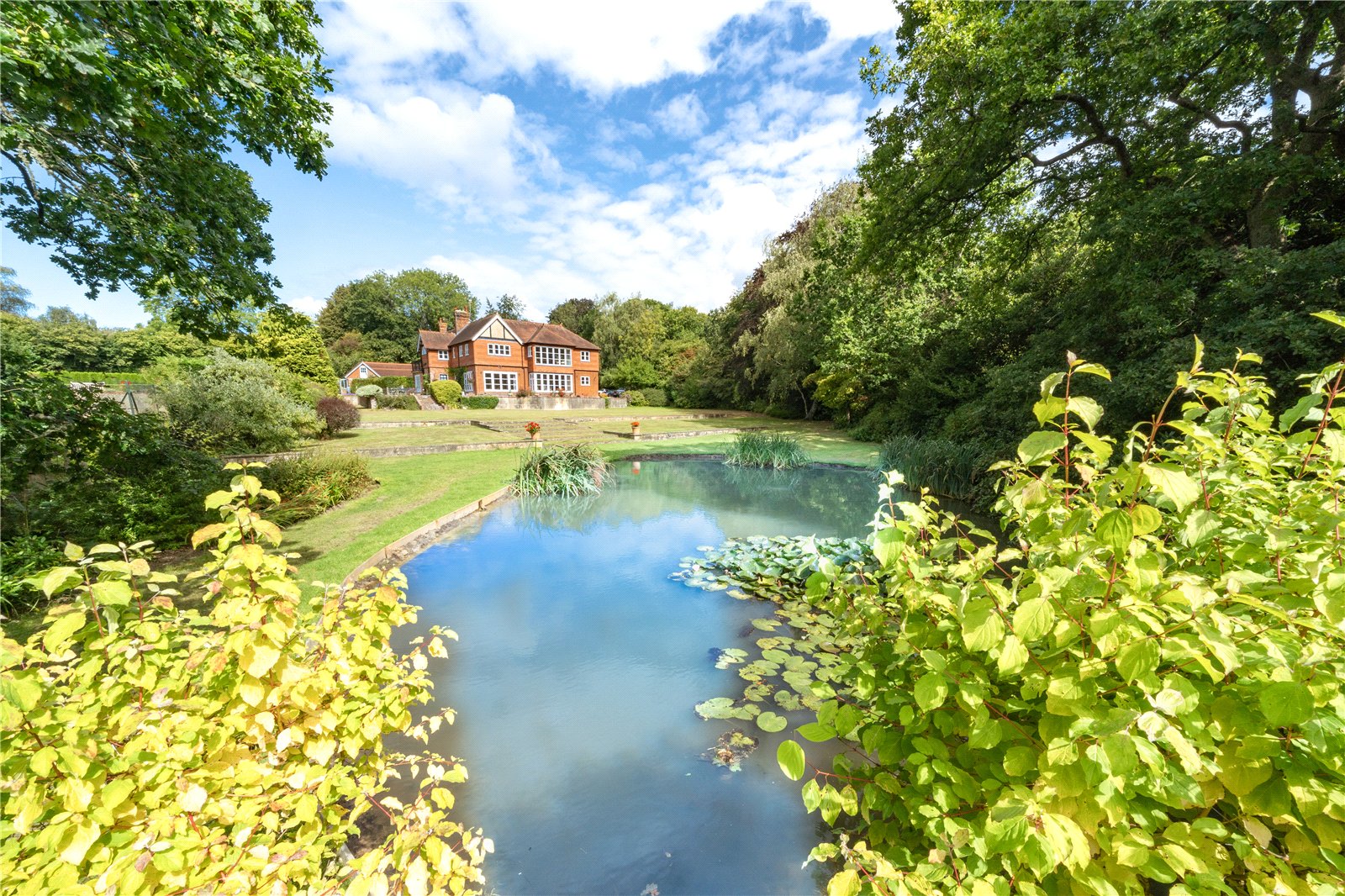 To the rear, the grounds extend into delightful terraces, with far-reaching views over the formal lawns and mature borders. A superb all-weather tennis court provides excellent leisure facilities, while beyond, the gardens open to a more natural landscape featuring a large ornamental pond, and beyond further a fabulous feature lake complete with jetty and surrounded by mature trees — creating a picturesque focal point and peaceful retreat.