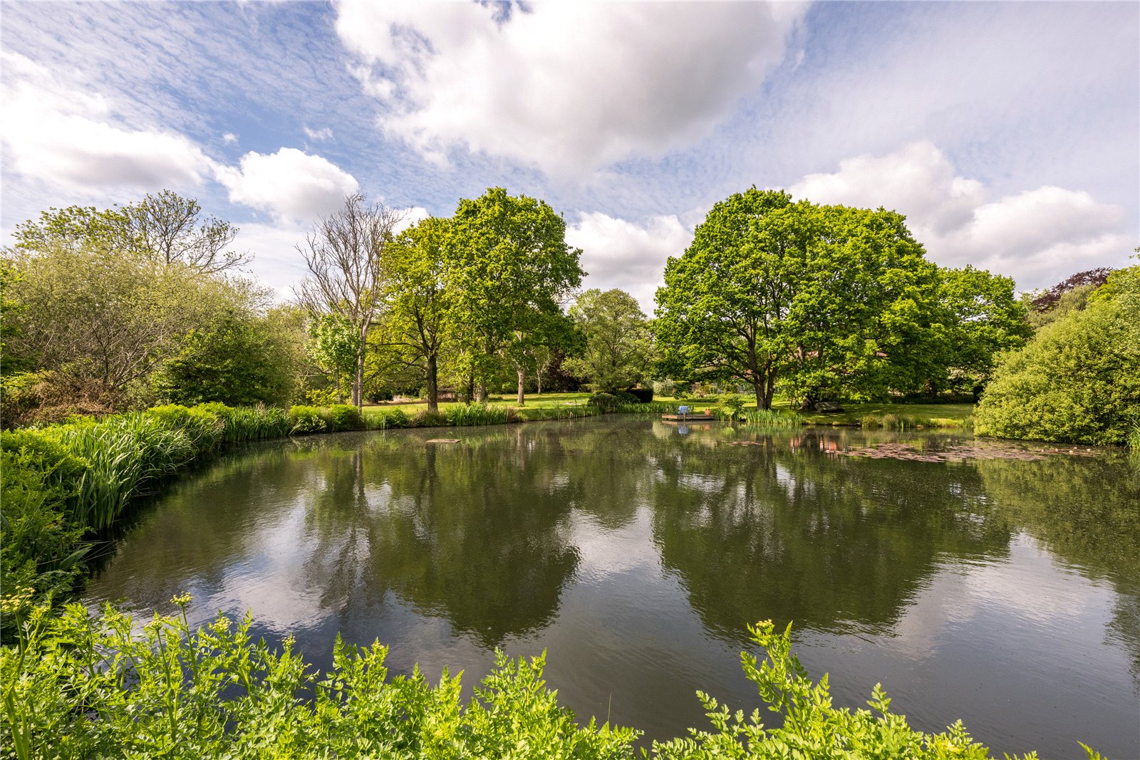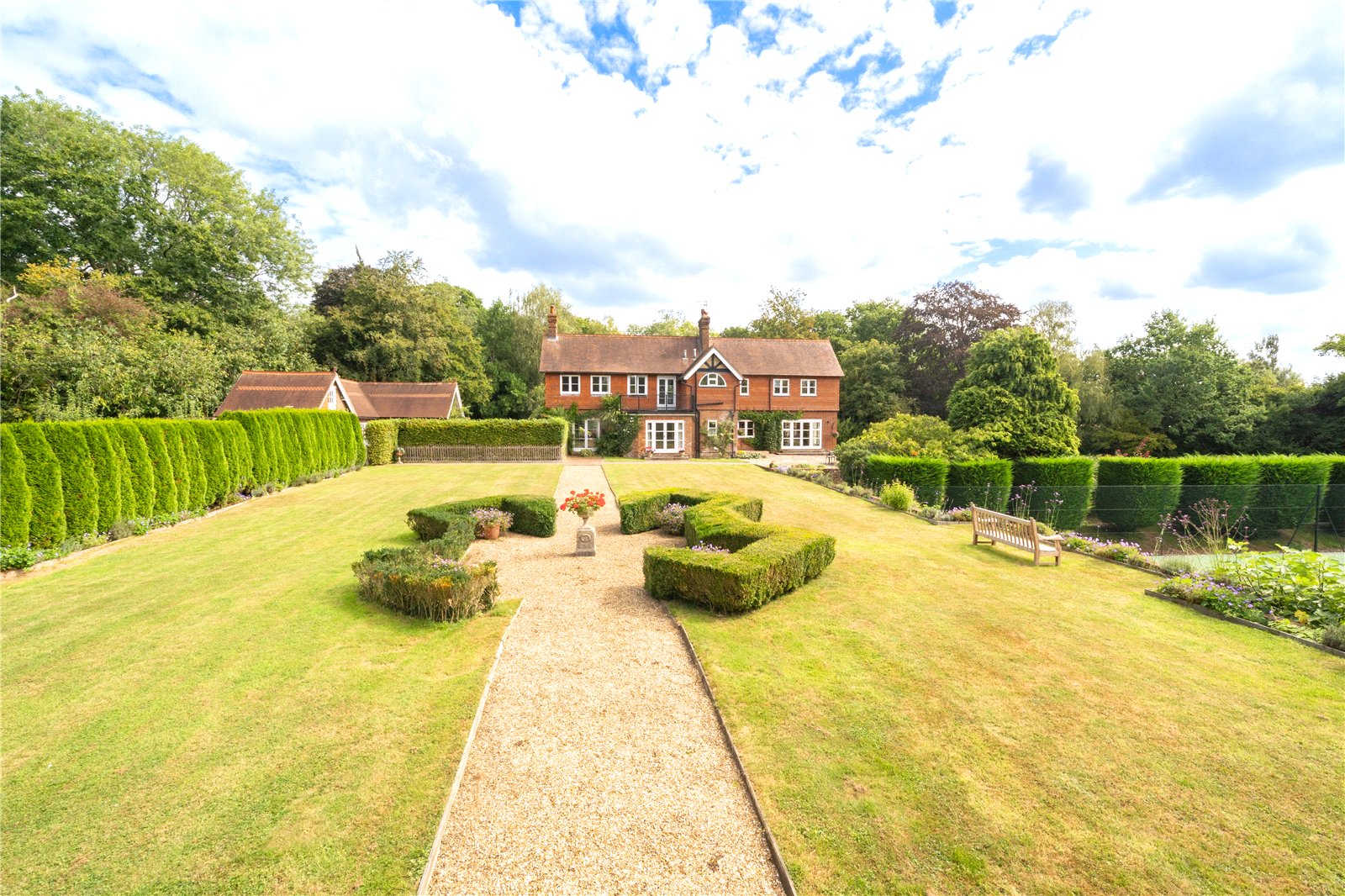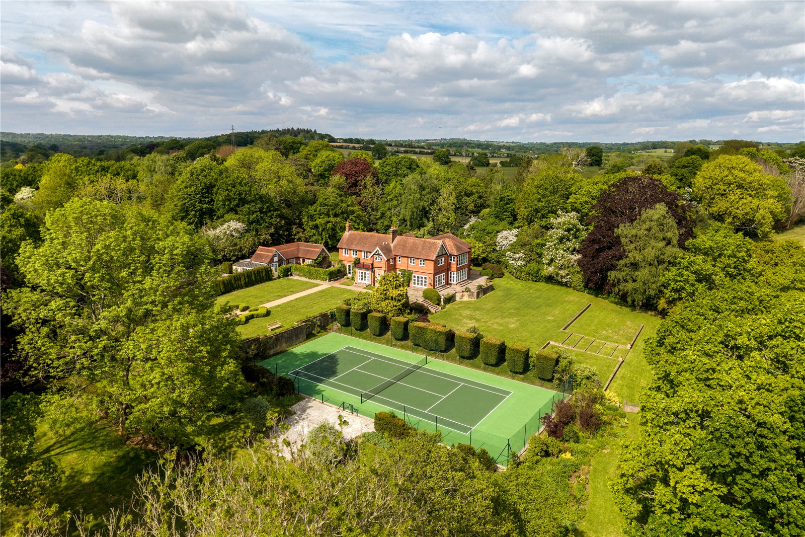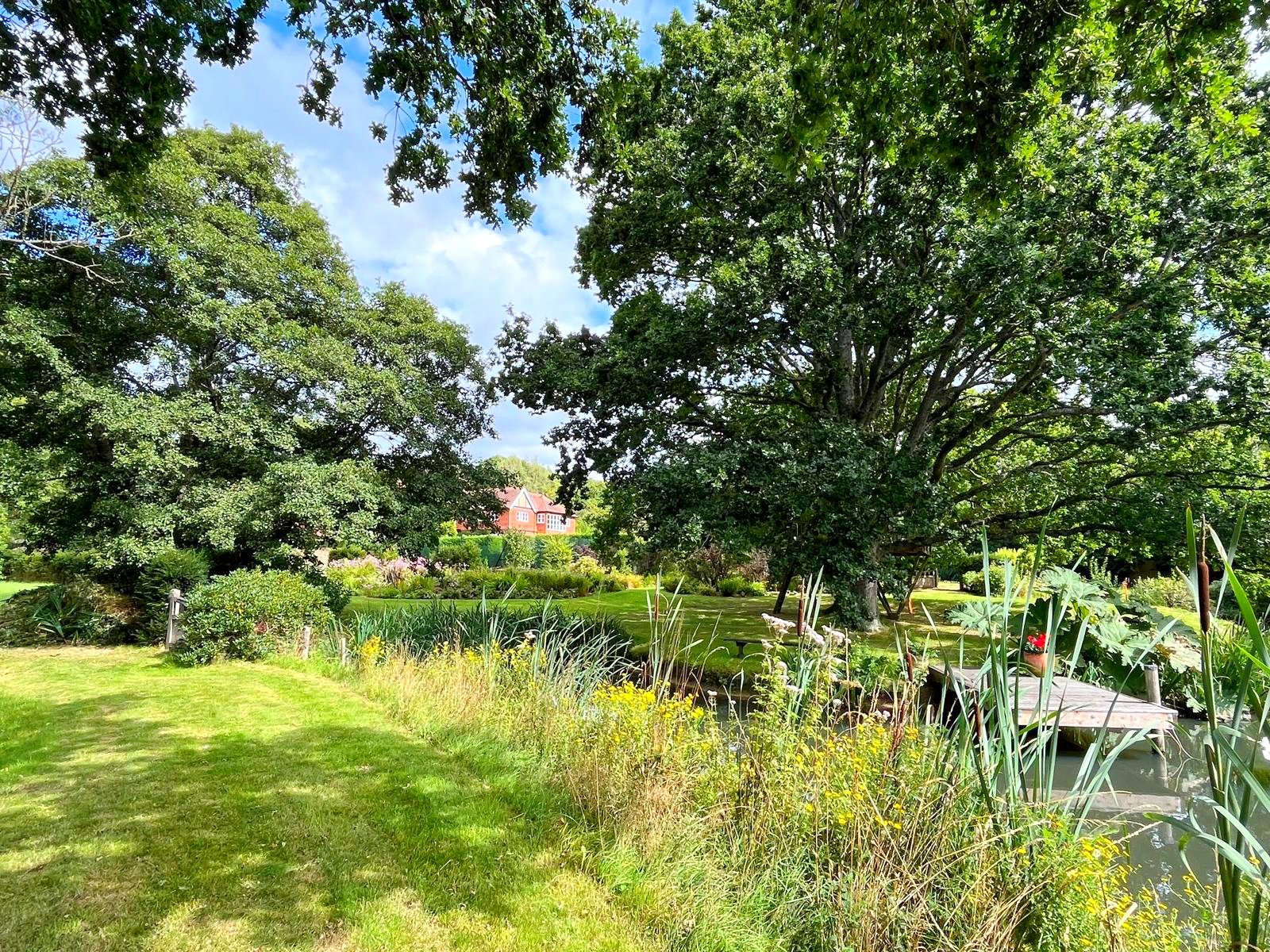 To the rear, the grounds extend into delightful terraces, with far-reaching views over the formal lawns and mature borders. A superb all-weather tennis court provides excellent leisure facilities, while beyond, the gardens open to a more natural landscape featuring a large ornamental pond, and beyond further a fabulous feature lake complete with jetty and surrounded by mature trees — creating a picturesque focal point and peaceful retreat.