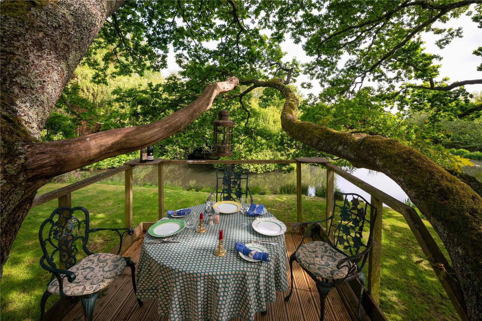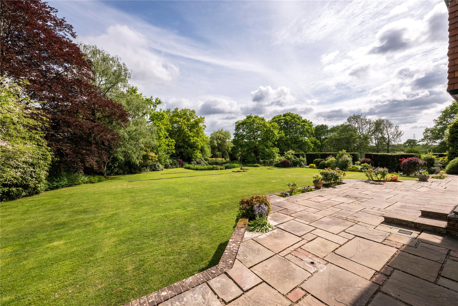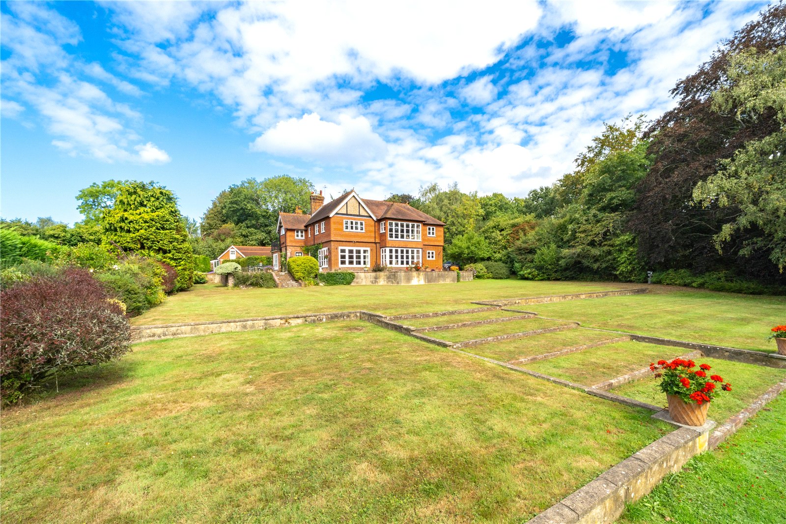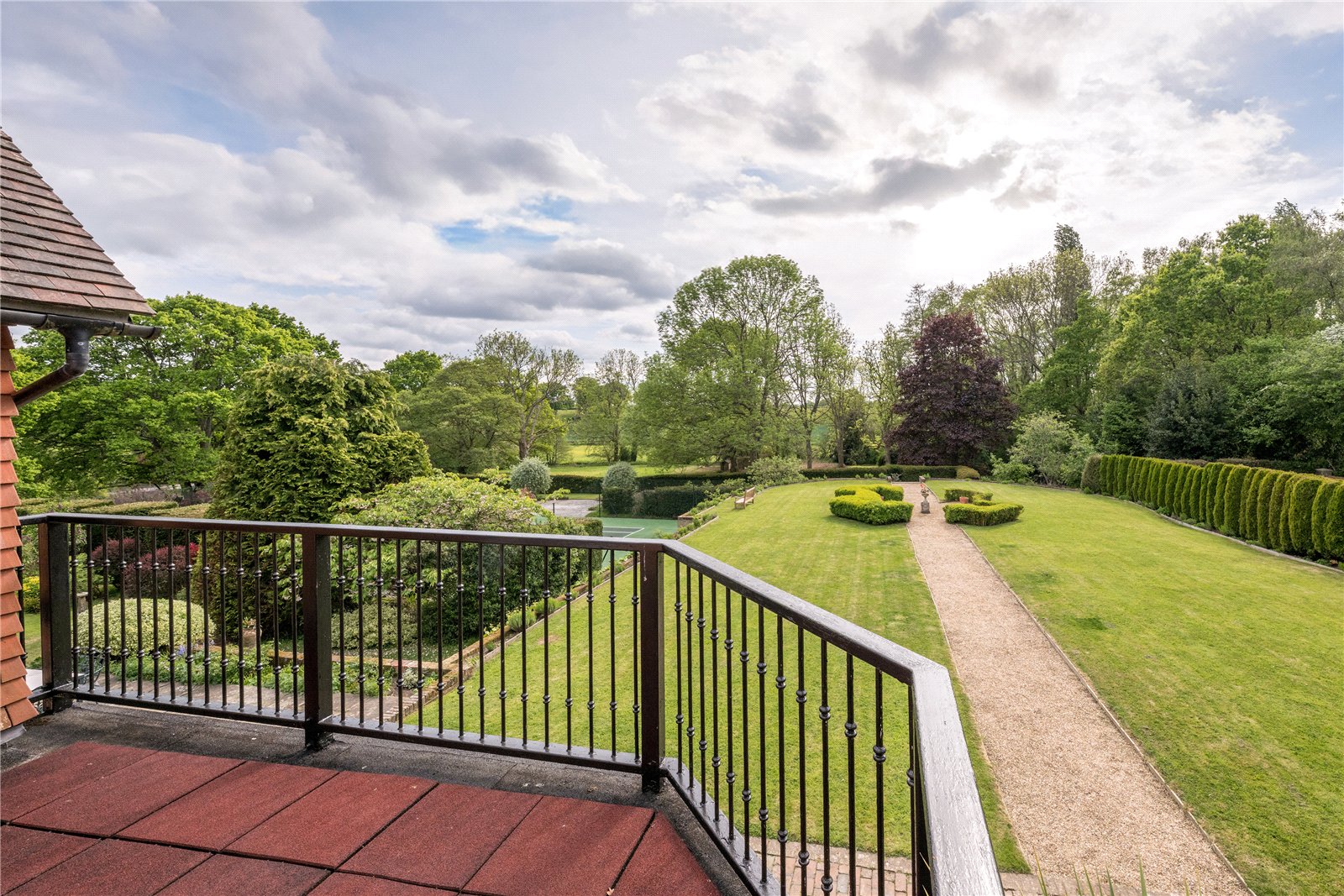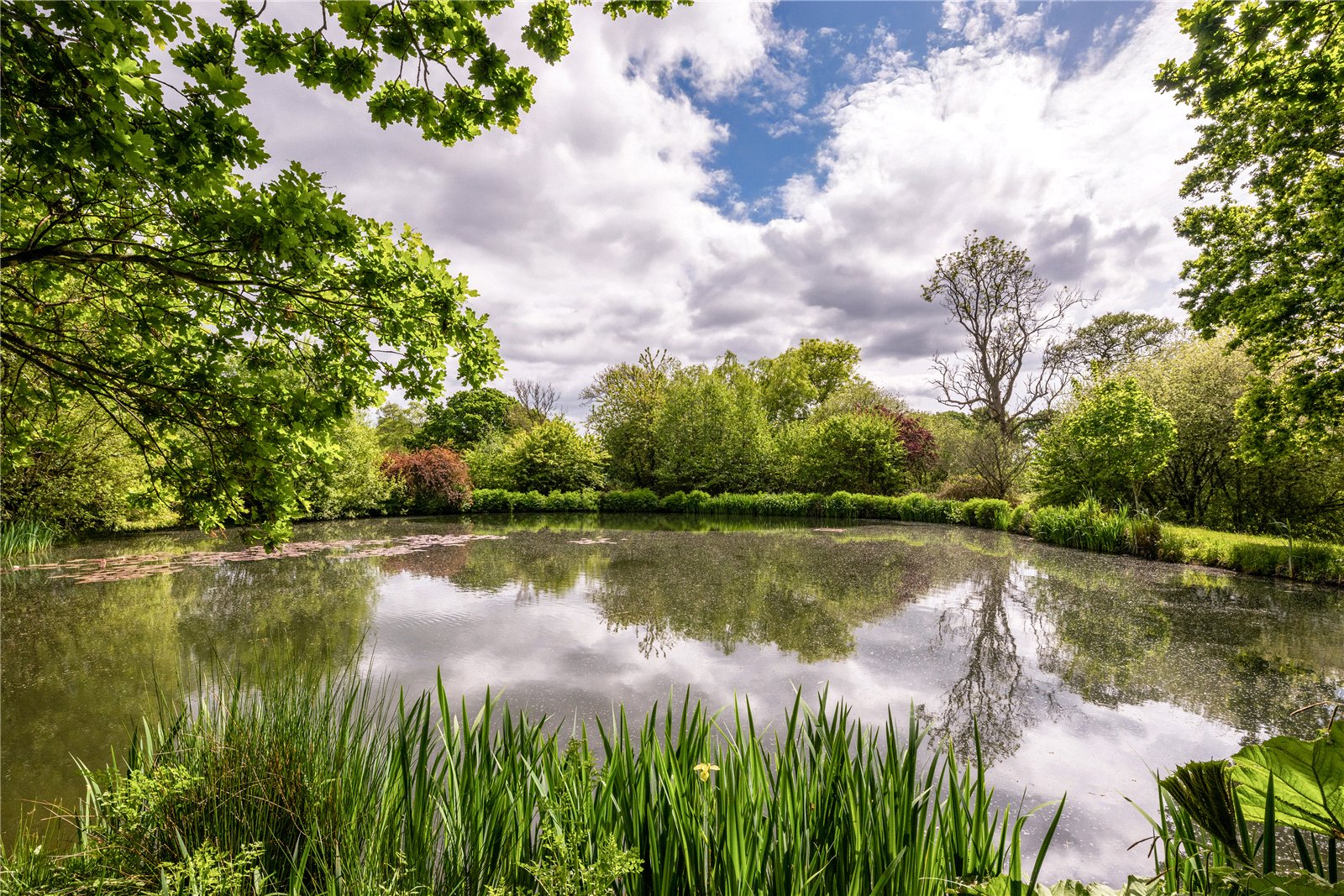 To the rear, the grounds extend into delightful terraces, with far-reaching views over the formal lawns and mature borders. A superb all-weather tennis court provides excellent leisure facilities, while beyond, the gardens open to a more natural landscape featuring a large ornamental pond, and beyond further a fabulous feature lake complete with jetty and surrounded by mature trees — creating a picturesque focal point and peaceful retreat.