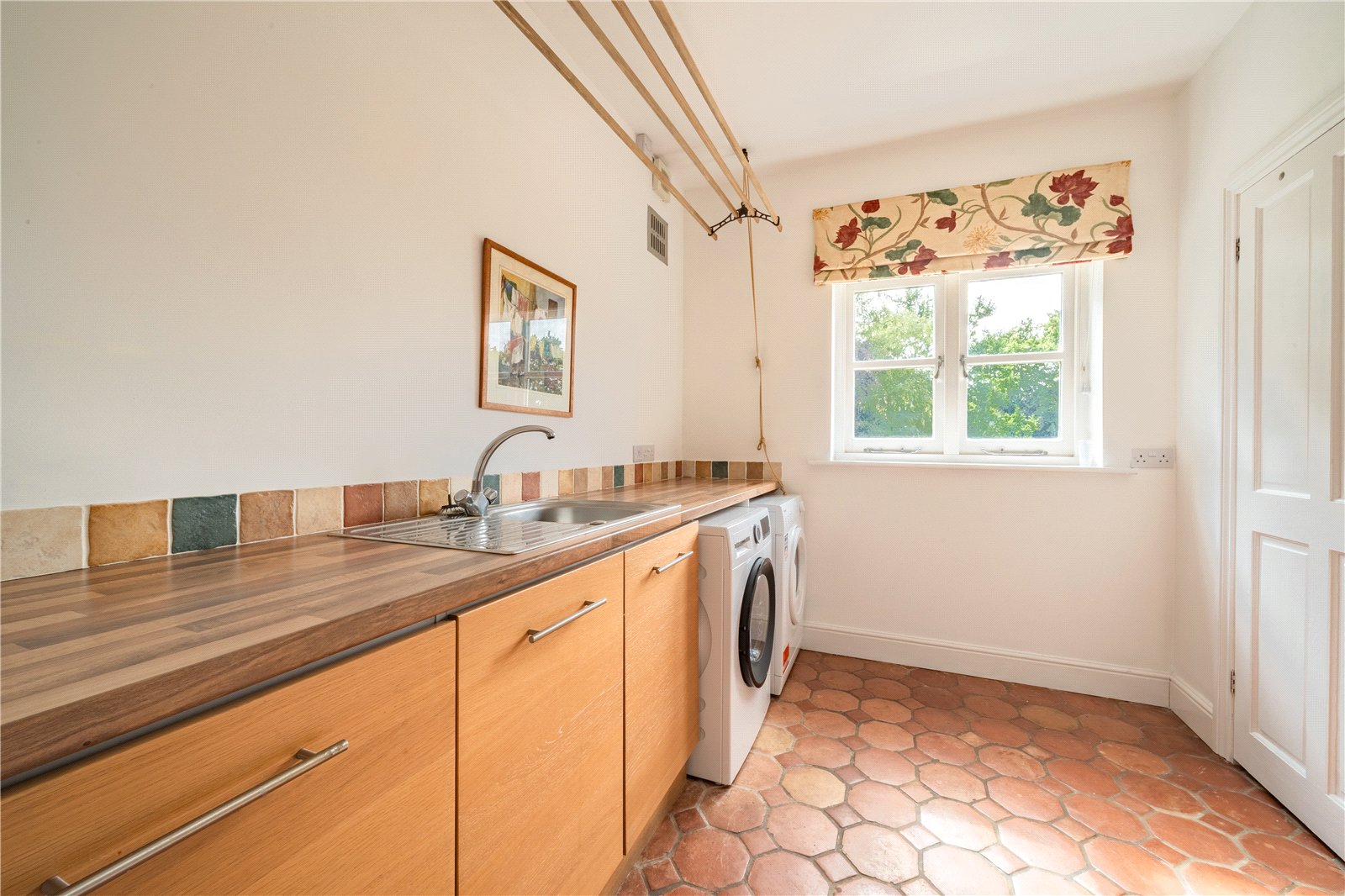 UTILITY ROOM: The utility room is a highly practical space, fitted with a good range of cupboards and work surfaces, together with a sink and drainer. There is space and plumbing for laundry appliances, while the tiled splashback and terracotta-style flooring add a touch of character. A window to the rear provides natural light, and ceiling-mounted drying racks maximise functionality. Perfectly designed to keep household tasks separate from the main living areas, this room is both convenient and efficient.