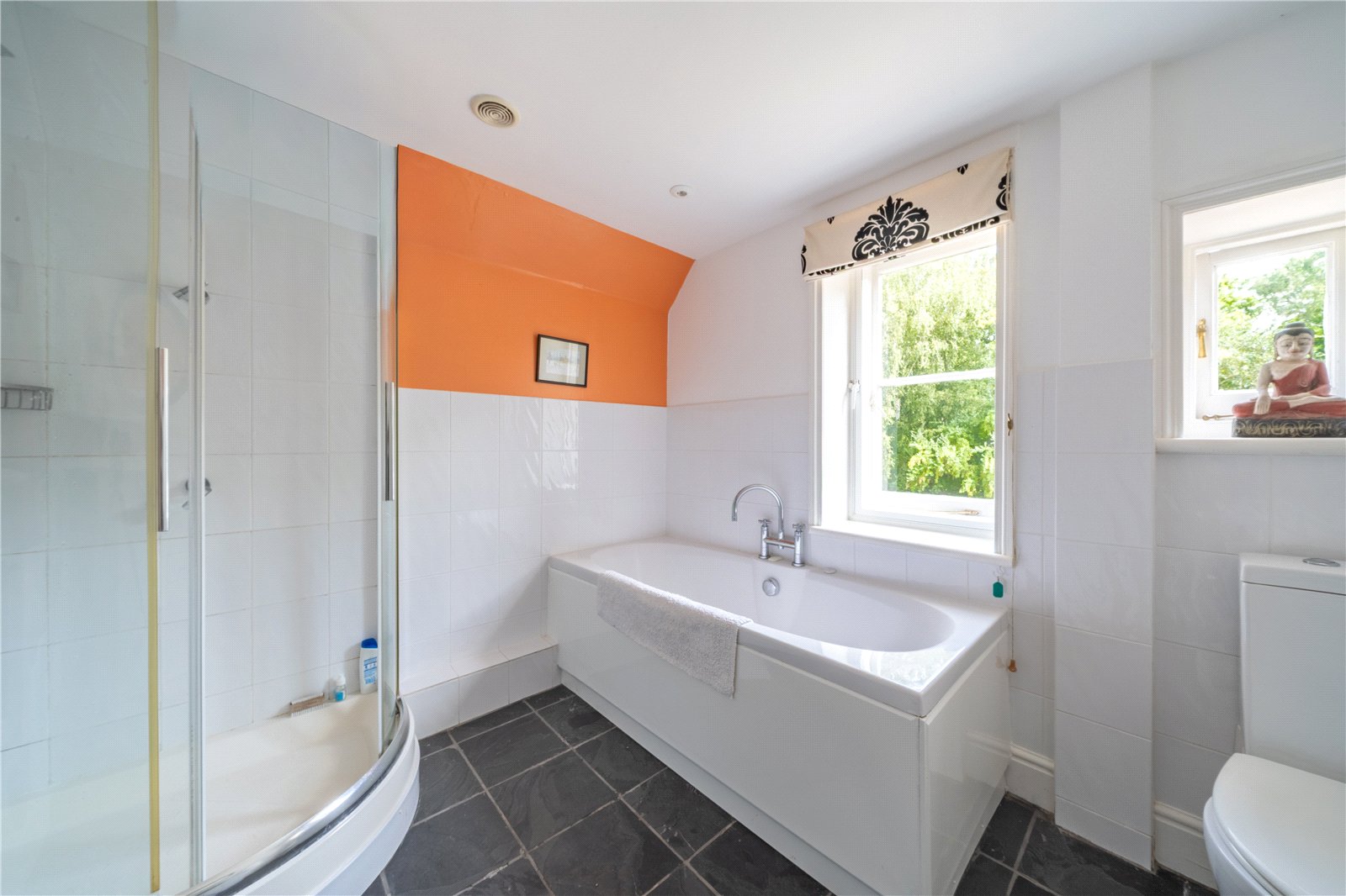 FAMILY BATHROOM: The family bathroom is generously proportioned and designed to combine practicality with comfort. A modern white suite includes a panelled bathtub with central taps, a separate curved-glass shower enclosure, a sleek wash hand basin set within fitted cabinetry, and a close-coupled WC. Natural light floods the room through dual windows, creating a bright and airy feel, while contrasting slate-style tiled flooring adds a touch of sophistication. The bold accent wall brings a contemporary splash of colour, giving this space character and style, whilst the tiled surrounds ensure ease of maintenance — ideal for busy family living.