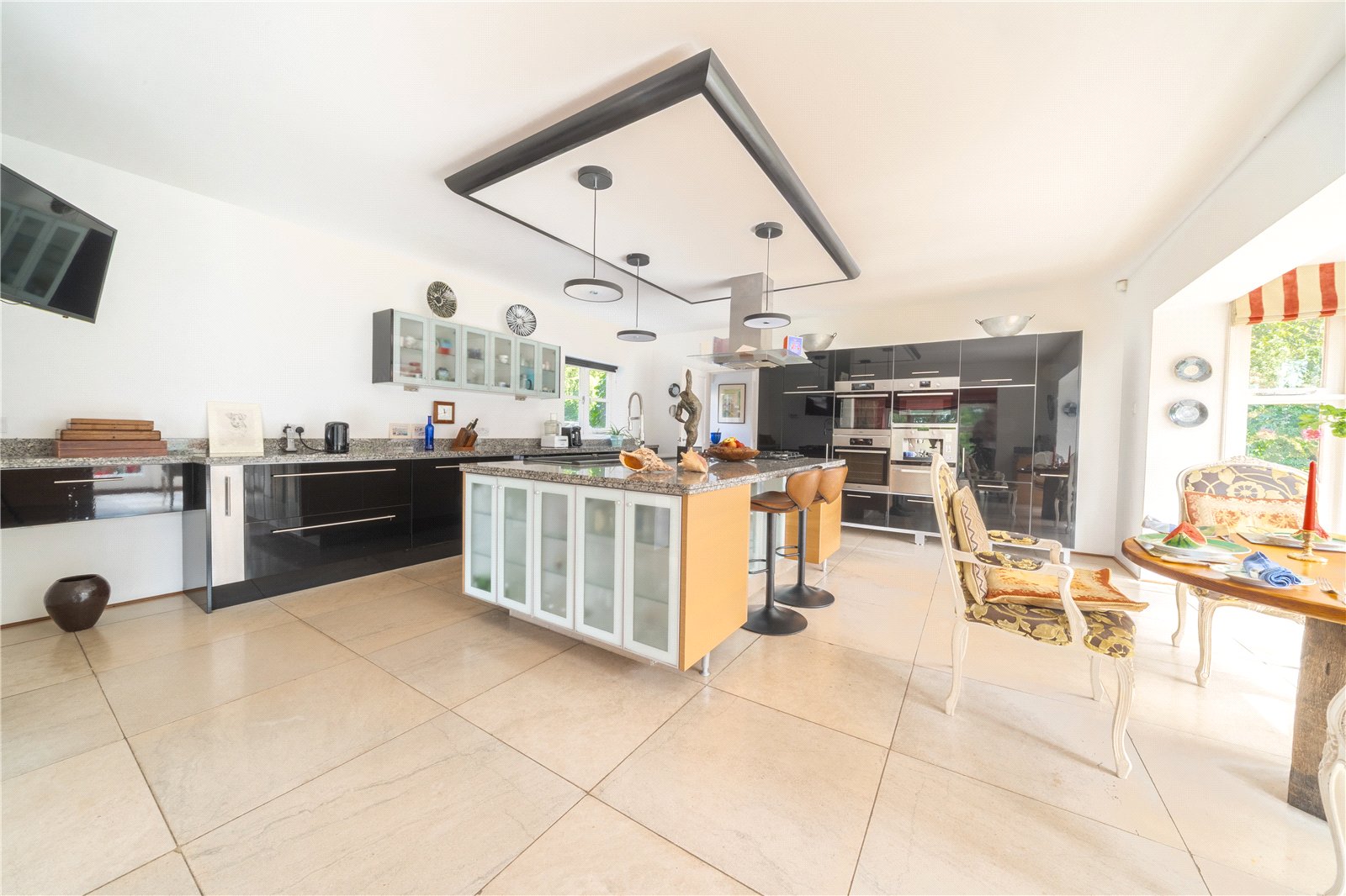 KITCHEN/BREAKFAST ROOM: The kitchen and breakfast room is a striking contemporary space, designed with both style and functionality in mind. Sleek black cabinetry is complemented by granite worktops and a central island with breakfast bar seating, offering excellent preparation and casual dining space. Integrated appliances are neatly concealed within glossy units, while the large tiled flooring enhances the modern feel. To one end, a bright breakfast area is set within a wide bay of full-height windows and French doors, providing beautiful garden views and direct access outside. With ample space for both family dining and entertaining, this room serves as a true hub of the home.