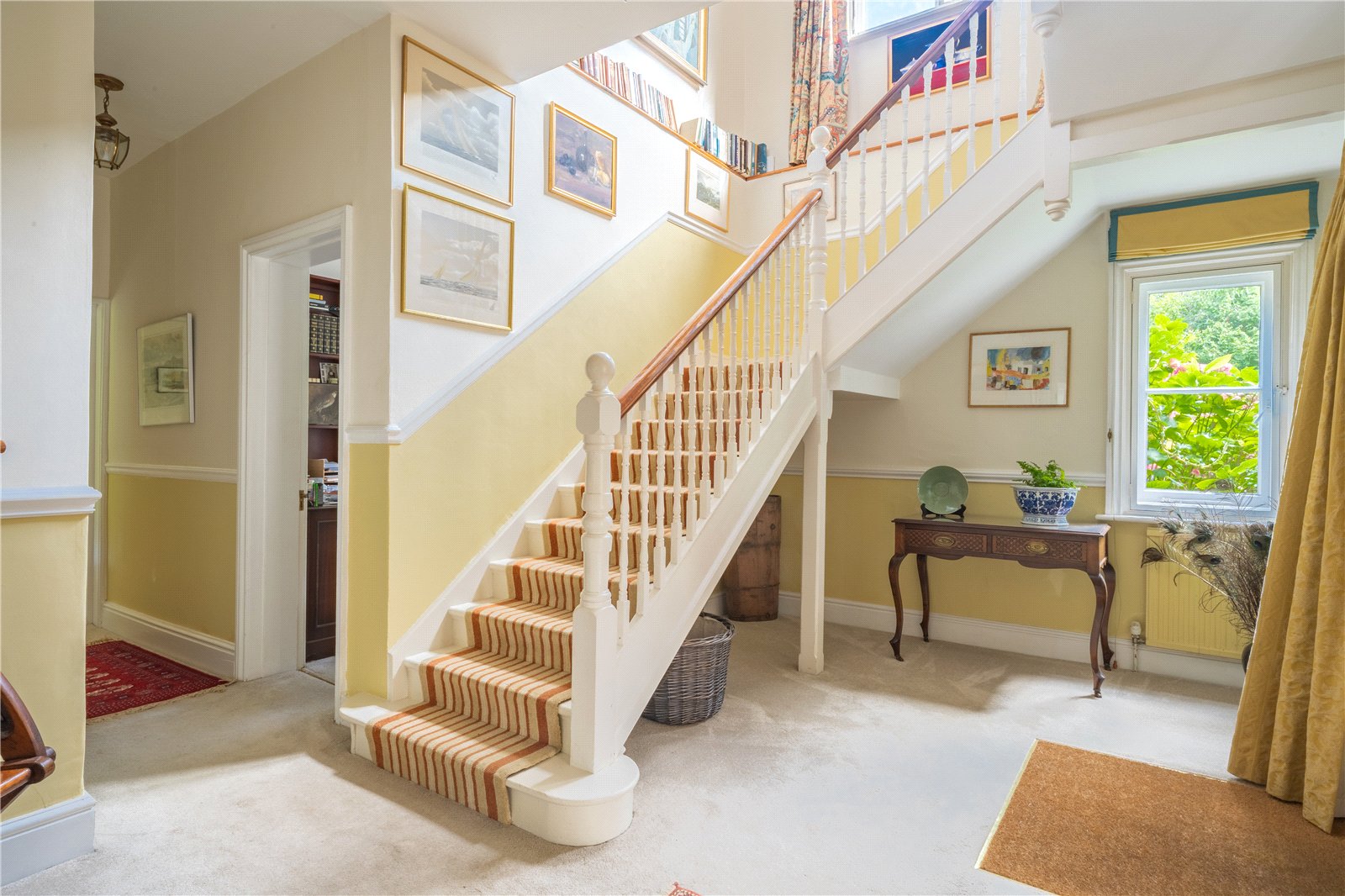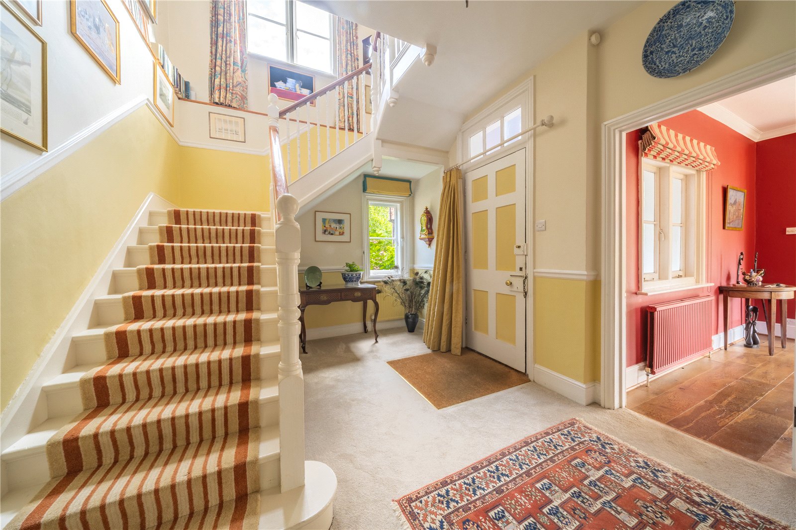 ENTRANCE HALL: The entrance hall provides a warm and welcoming introduction to the home, with a bright and airy feel enhanced by dual-aspect windows and a high ceiling. A central staircase with striped runner creates an attractive focal point, while the walls are lined with artwork and detailing that add to the charm of the space. There is plenty of room for occasional furniture, giving the hall both elegance and practicality, and the split-level stairwell with feature window allows natural light to cascade through. This inviting hall sets the tone for the character and style found throughout the property.