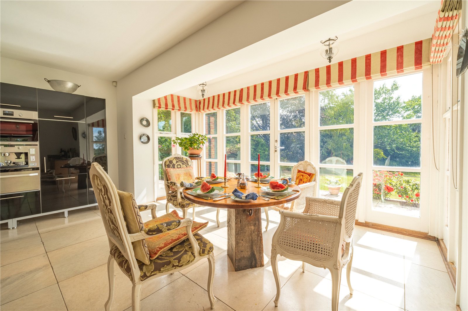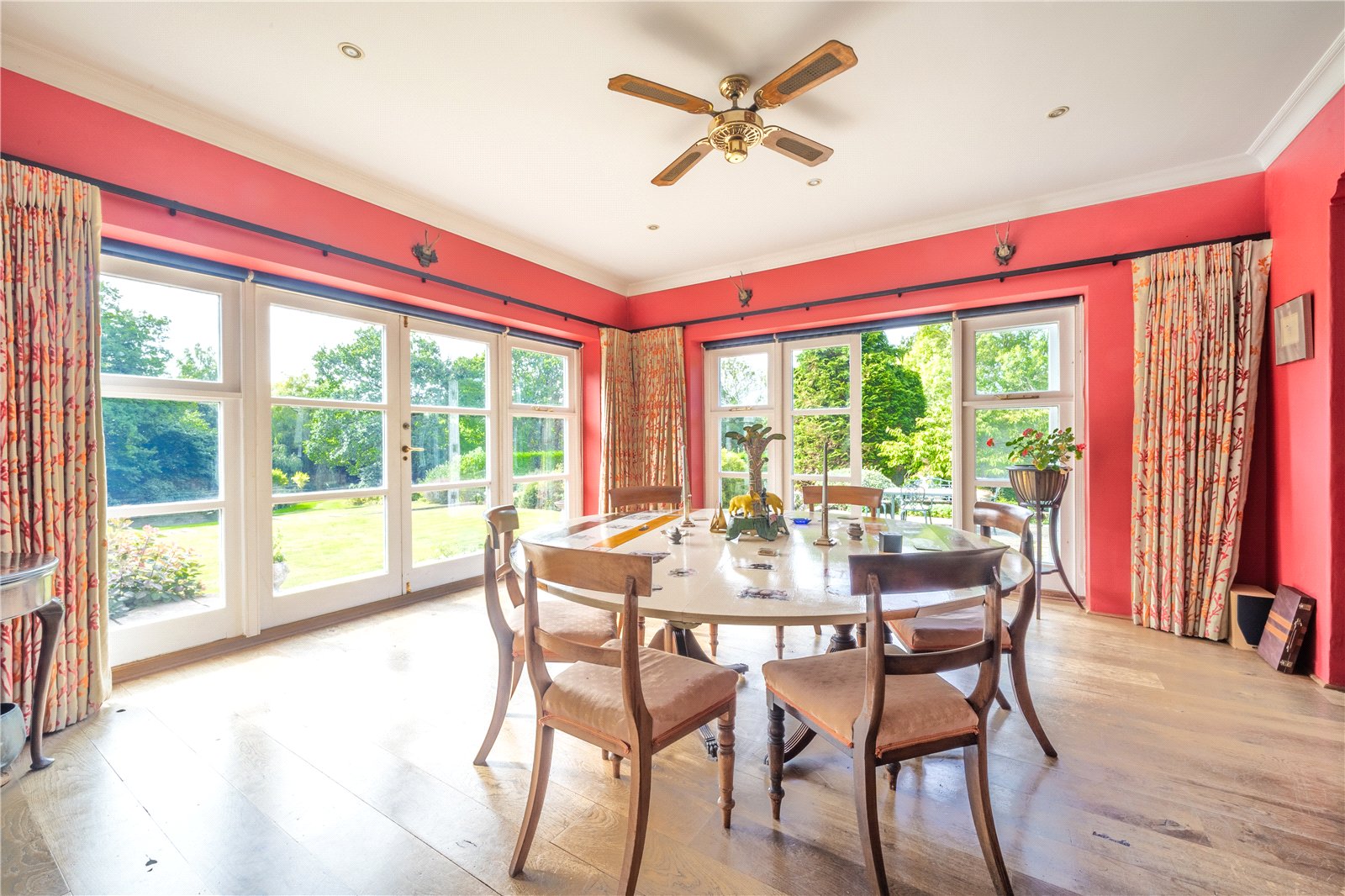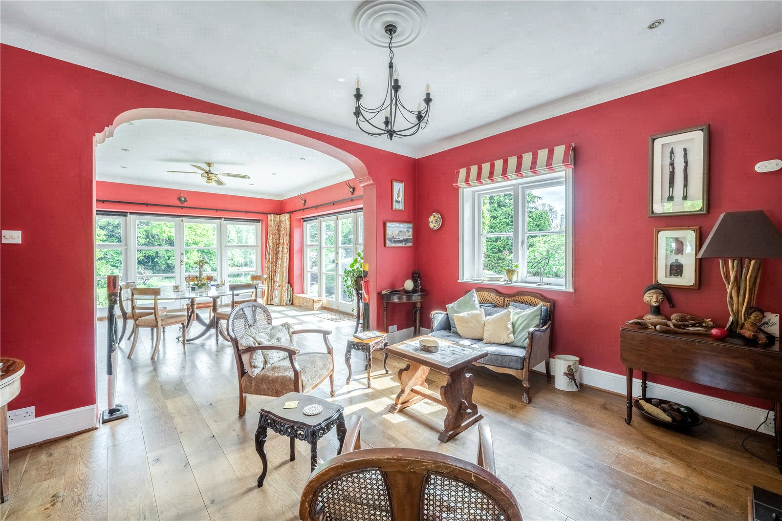 DINING ROOM: A wide archway opens seamlessly into the dining room, where full-height windows and French doors flood the room with natural light and frame glorious garden views. With ample space for a large dining table and additional seating, this versatile room combines sophistication with comfort, making it the perfect setting for both family gatherings and formal occasions. This space also benefits from rich red walls and solid oak flooring.