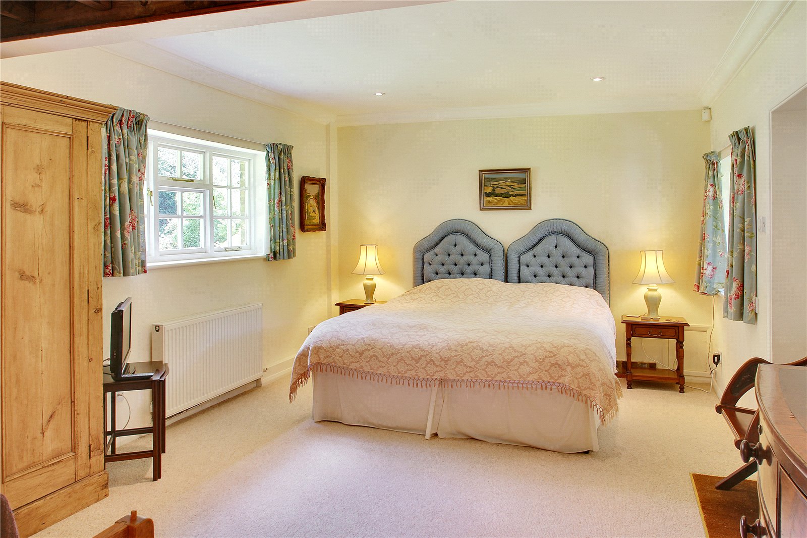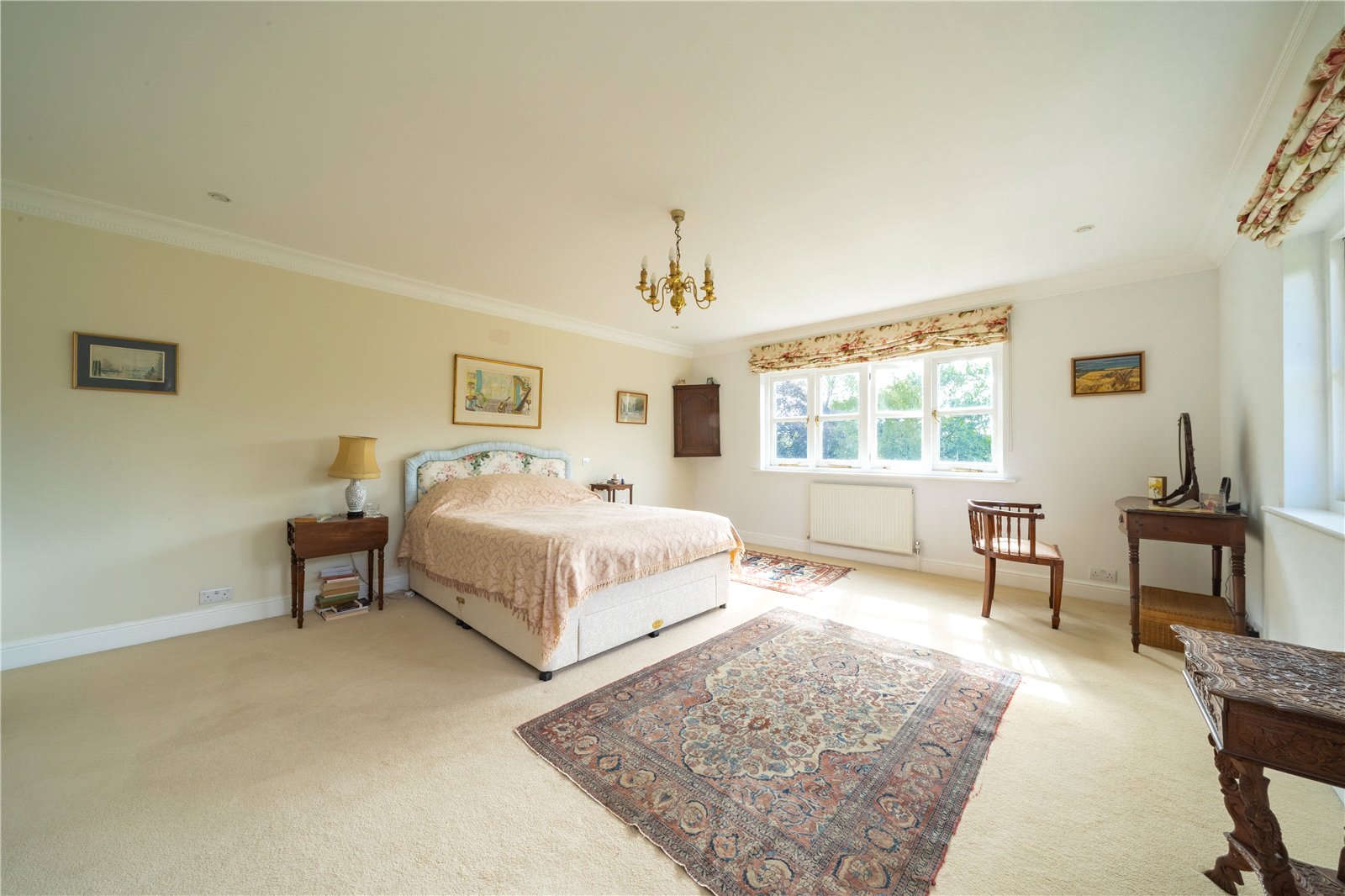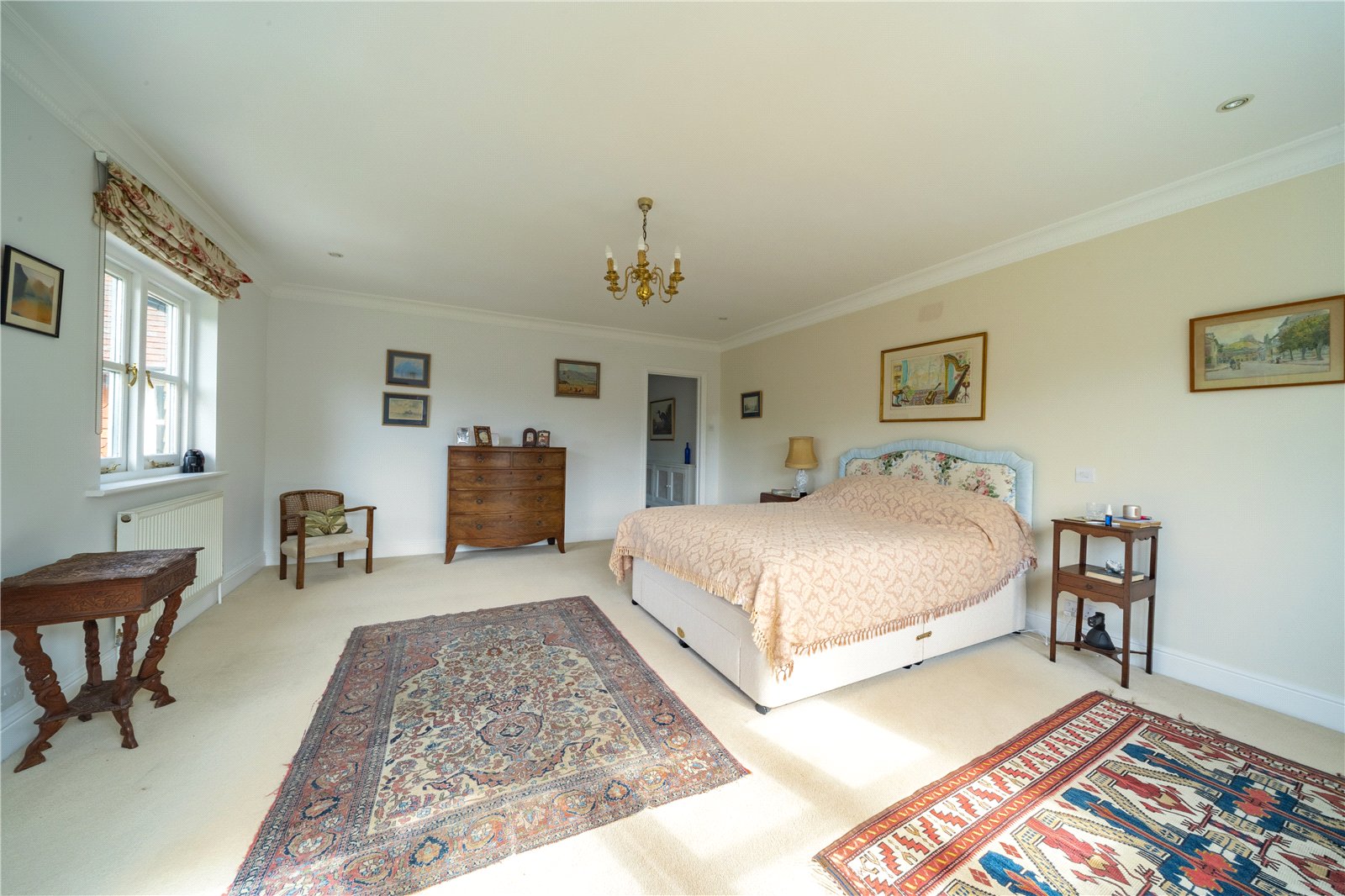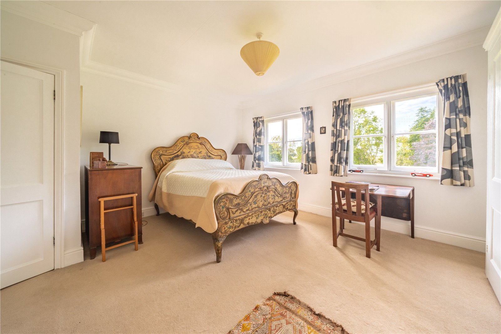 PRINCIPAL BEDROOM: The principal bedroom is an elegant and generously proportioned space, filled with natural light from multiple windows that enjoy far-reaching views over the gardens and surrounding countryside. The room is finished in soft neutral tones with classic detailing and offers ample space for both a large bed and a comfortable seating area, creating a serene and restful retreat.