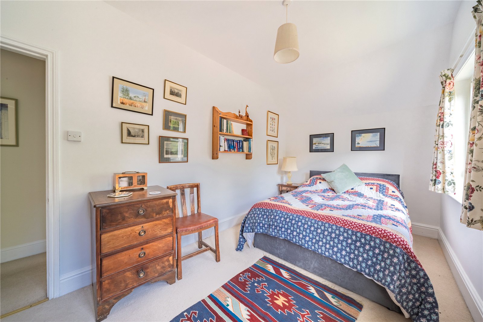 BEDROOM 4: This charming double bedroom is filled with natural light from dual sash windows overlooking the gardens. Its neutral décor and generous proportions create a calming retreat, while the space easily accommodates a double bed and additional furniture. Characterful touches such as the fitted shelving and display wall add warmth and individuality, making it an inviting and versatile room, ideal as a guest bedroom, child’s room, or peaceful study.