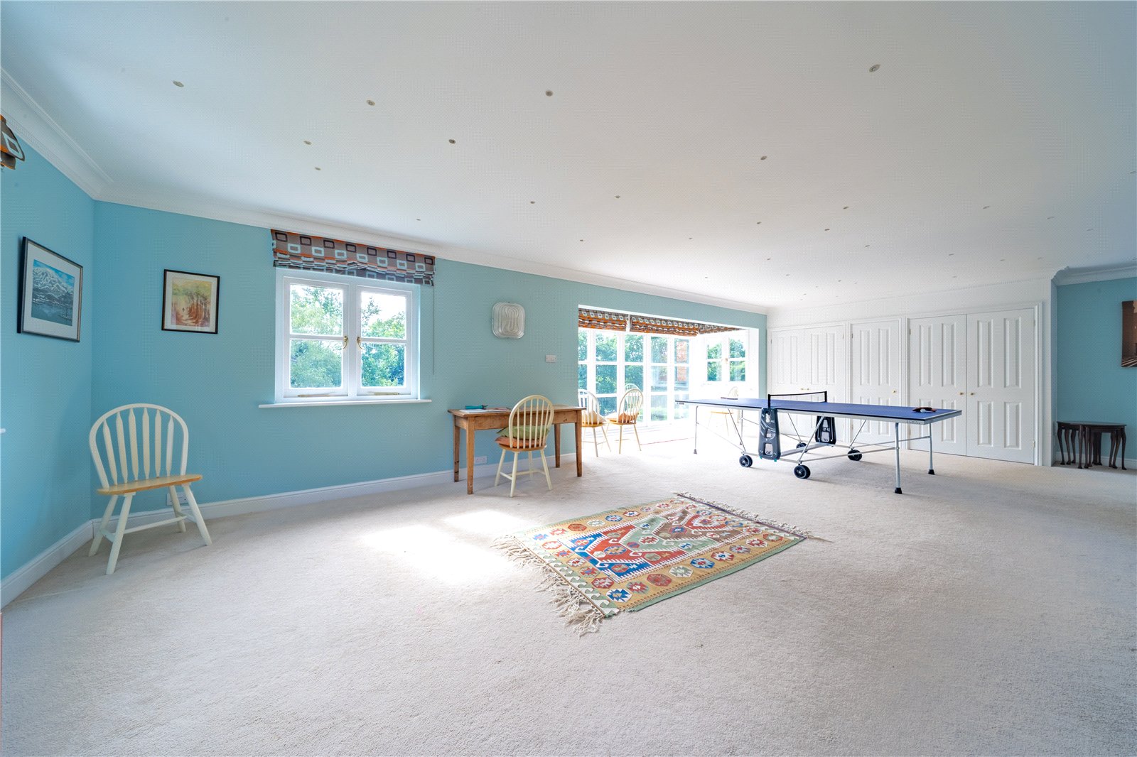 BEDROOM 5/GAMES ROOM: This exceptionally spacious and versatile room is currently arranged as a games and recreation space, with ample room for a full-size table tennis table and additional seating areas. Remarkable floor to ceiling three-sided observation, oriel window, flood the room with natural light while offering delightful elevated views across the gardens. The light blue walls and neutral carpeting create a calm and welcoming atmosphere, making the room equally well-suited as a bedroom, studio, or family living area. Extensive built-in storage runs along one wall, ensuring practicality matches the scale of the space. A charming adjoining snug, perfect as a reading nook or study area, further enhances the flexibility of this impressive room. If a potential buyer wanted to make this a fifth bedroom with an en-suite all the plumbing is below the flooring for this bedroom, making it easier for a separate en-suite installation, if so desired.