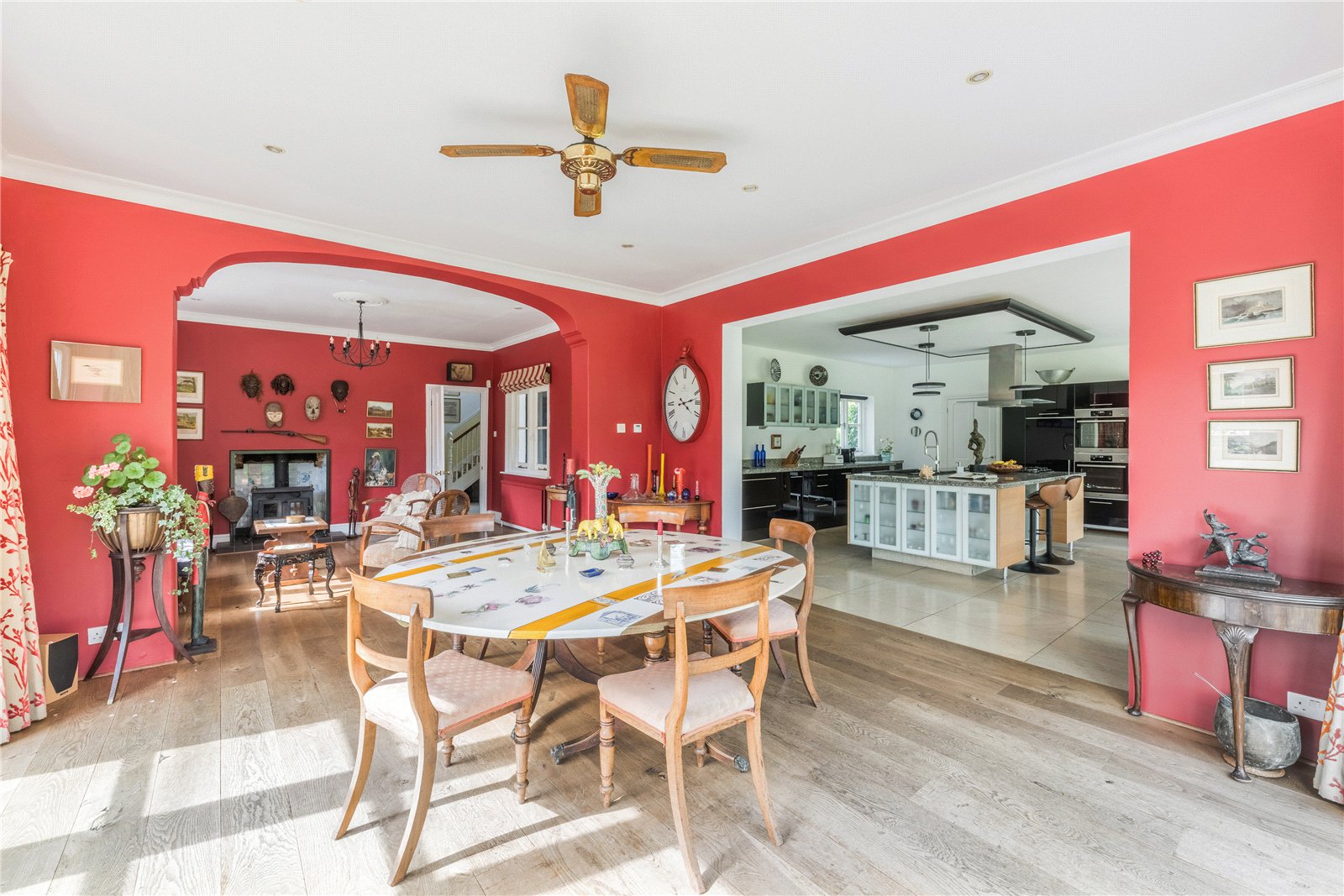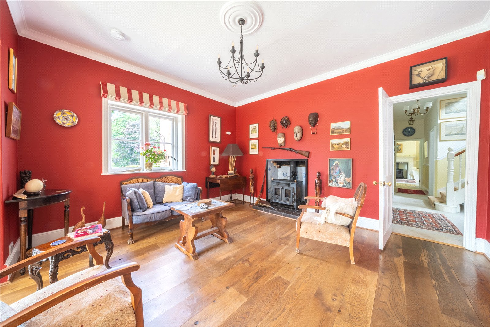 FAMILY ROOM: The family room is an impressive and beautifully proportioned space, ideal for entertaining on a grand scale. Finished with rich red walls and solid oak flooring, the room exudes warmth and character, complemented by decorative ceiling cornicing and an elegant fireplace with wood-burning stove. This is a room where you can relax, read, chat, snooze, in front of the warming wood burner in winter time, where the family naturally gravitates.