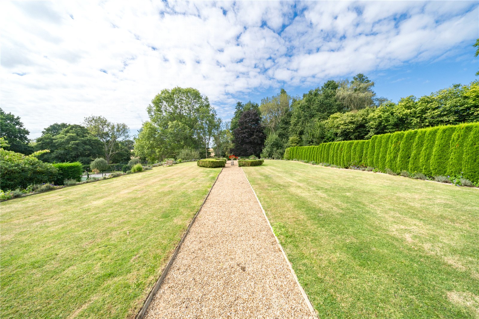 There are also productive areas including a kitchen garden with two greenhouses and growing beds, ideal for those with an interest in horticulture. The overall grounds offer a wonderful blend of formality, recreation, and natural beauty, perfectly complementing the house.