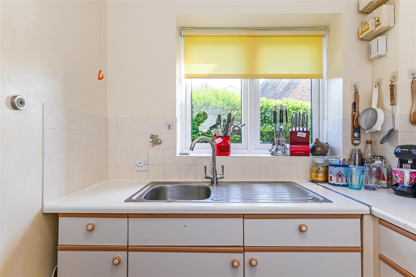 The large living room provides a lovely social space for entertaining visitors or family and is also flooded by natural light from another south facing window which enjoys outlooks over the start of East Wittering village. just off the living room lies the kitchen which is lined with units and cupboards and houses an electric stove with oven and grill and a tiled splashback behind. The kitchen also enjoys outlooks over the communal gardens and towards the residents lounge and ornamental pond.
