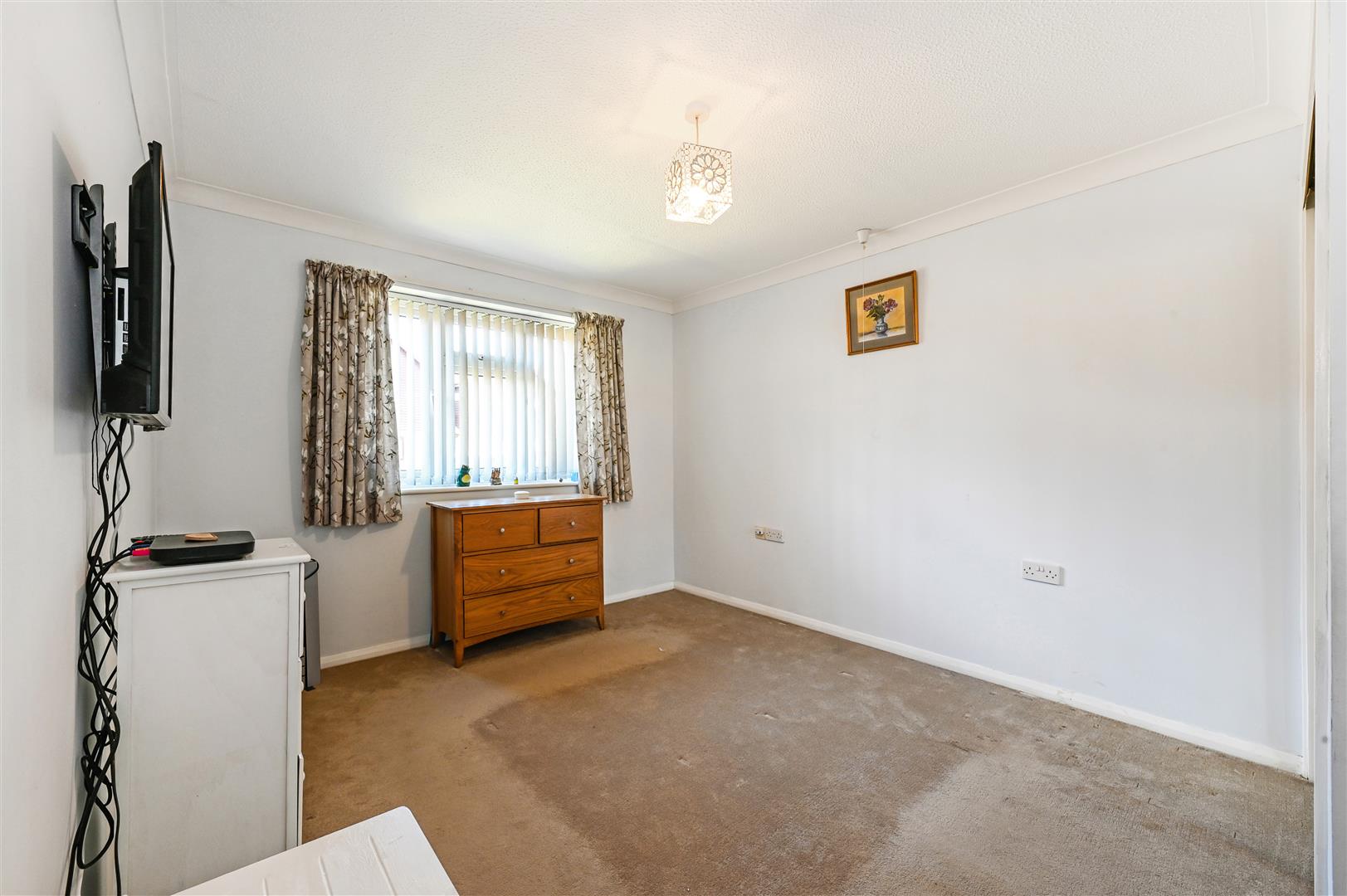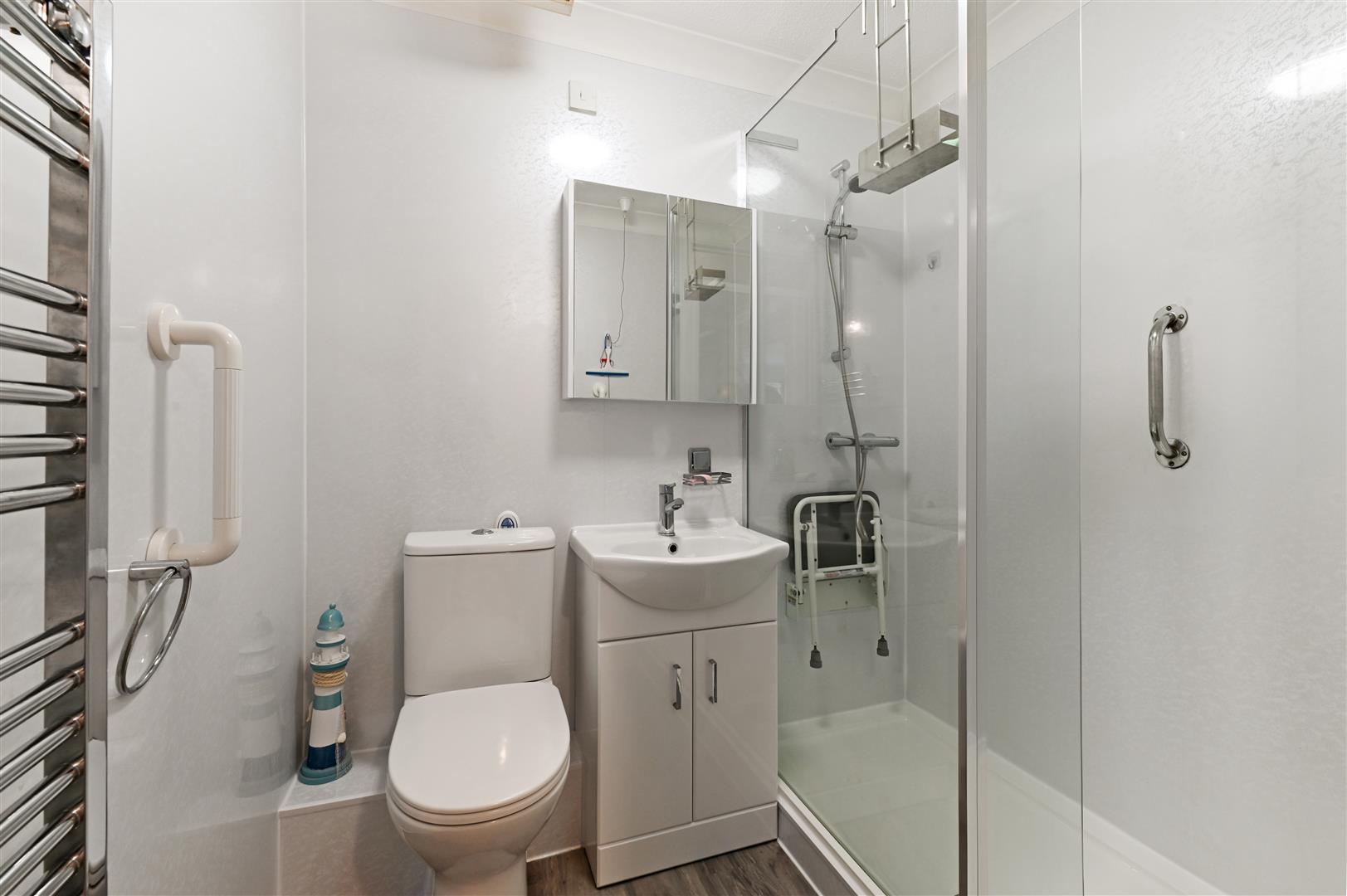 Upon arrival to number 34 you are greeted by a communal door and entrance hall before the private entrance of the flat. Entering the flat you are greeted by a lovely wide, carpeted entrance hall and storage cupboard which houses the hot water tank and bathroom with walk in shower, WC, vanity unit and is lined with mermaid board.