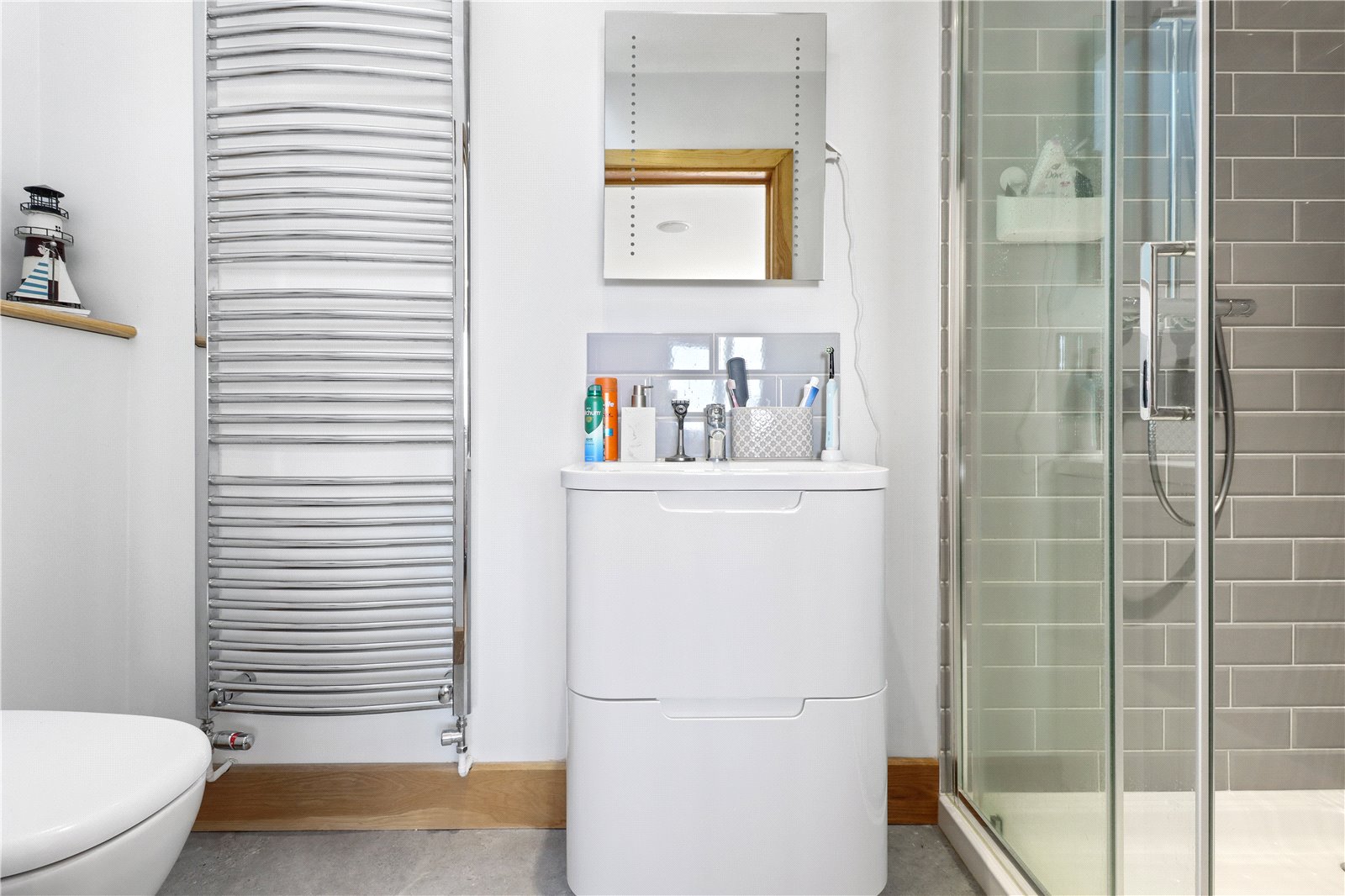 ENSUITE LUXURY SHOWER ROOM FOR BEDROOM TWO: Comprising of tiled floor with underfloor heating, Low Level W.C., chrome wall mounted radiator, concealed flush system, oak shelving plinth, double glazed Velux style window to ceiling, downlighting, feature wash basin with curved front and matching high gloss vanity storage under, tiled splashback, chrome mixer tap, wall mounted mirror with lighting. Double sized shower with heavy glazed front and tiled walls, shower control system.