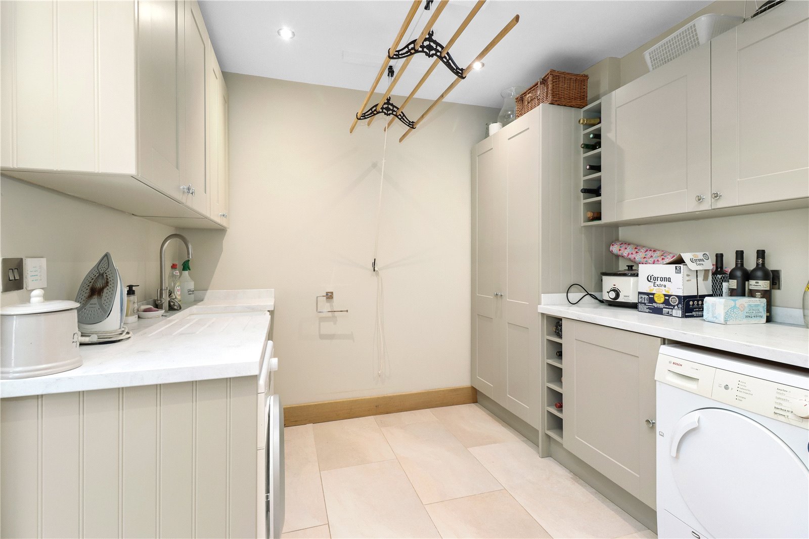 UTILITY ROOM: Approached from the kitchen and comprising of the continuation of the elegant tiled flooring with underfloor heating, range of modern Shaker style cupboard and base units with work surfaces over, wine racks, space for dryer, space for washing machine, fitted butlers sink, chrome mixer tap, oak door leading to rear vestibule.