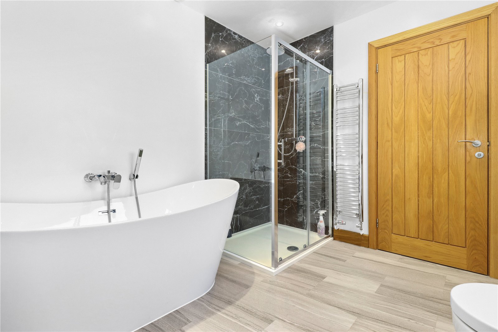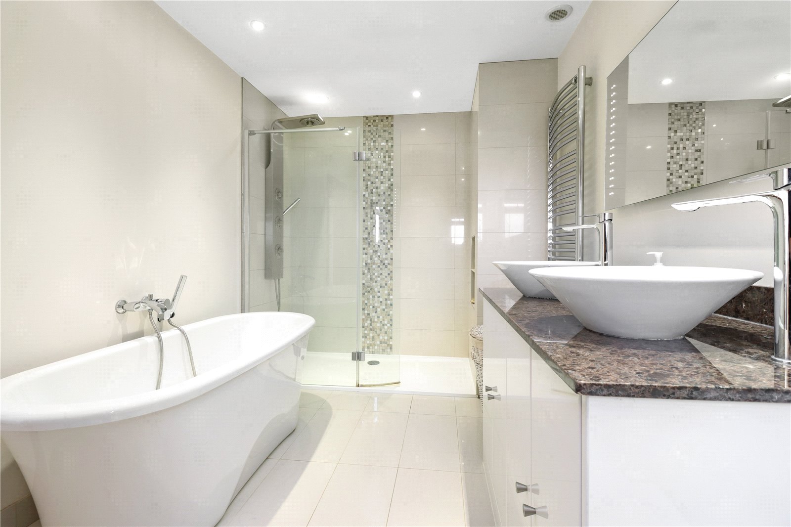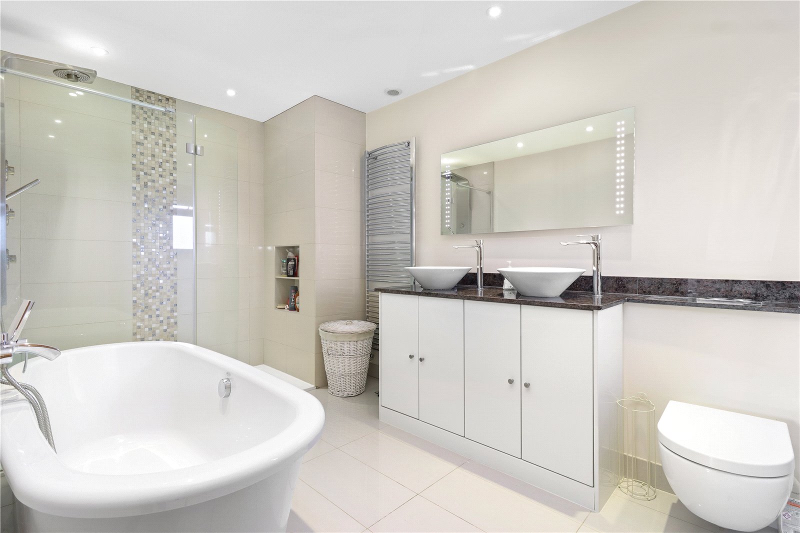ENSUITE BATHROOM / SHOWER ROOM FOR BEDROOM ONE: Comprising of tiled flooring with underfloor heating, Low level W.C., with concealed cistern, chrome radiator / towel rail, twin feature wash basins set above granite tops with chrome mixer taps and high gloss vanity cupboards under, wall mounted auto light wide mirror, further wall mounted chrome radiator, downlighting, feature modern rolltop bathe with chrome mixer tap with shower attachment, separate double shower with heavy glazed front, tiled walls and shower control system, double glazed window.